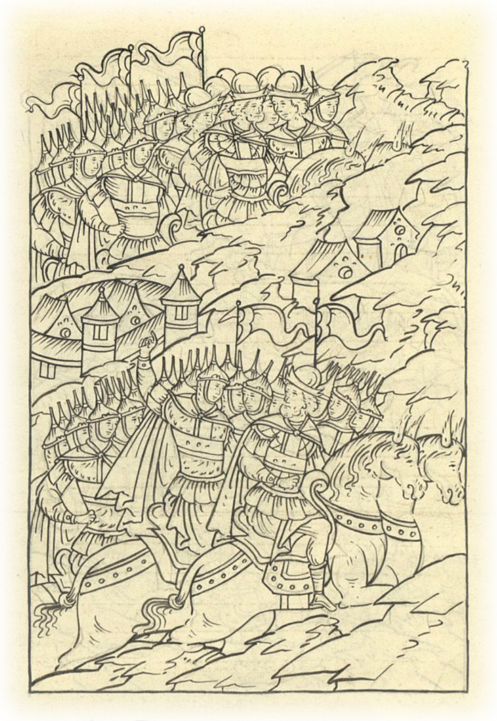 Языки говорят воеводам царя Ивана Васильевича, что магистр окопался большим рвом вокруг города Рындола, бьет из пушек и пищалей и приступает к Рындолу.