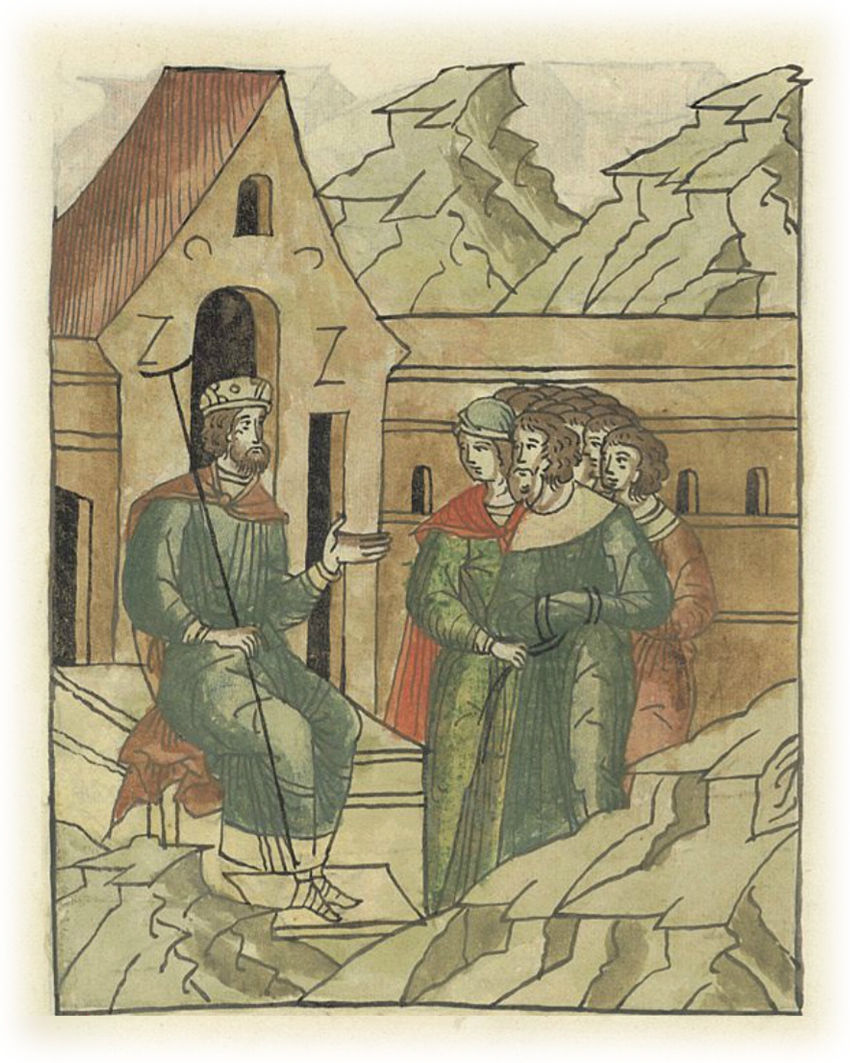 И послов новгородских схватил: посадника Юрия Ивановича, Стефана Твердиславича, Семена Борисовича, Вячеслава Климентьевича, Терентия Темника, Мануила Яголчевича, Якуна Данкова и иных многих, известных во всех землях славою, честью и богатством.