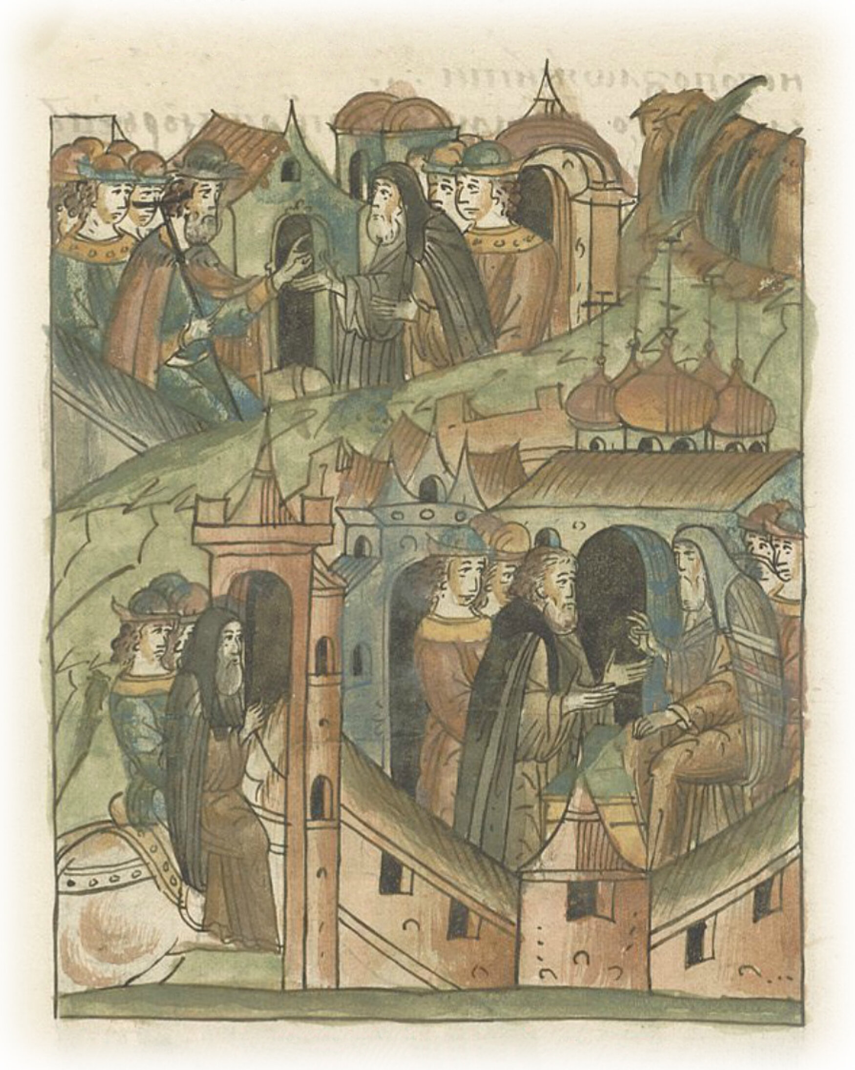 О поставлении архимандрита Силуяна в Юрьев монастырь в Великом Новгороде. В том же году государь великий князь самодержец всея Руси Василий Иванович прислал к богомольцу своему в Великий Новгород к архиепископу Макарию и повелел архиепископу своего архидьякона инока Силуяна поставить в попы, сан на него возложить и полицу*, и послать его архимандритом в Юрьев монастырь. * ромбовидный расшитый плат, носимый на правом бедре; принадлежность архиерейского облачения.