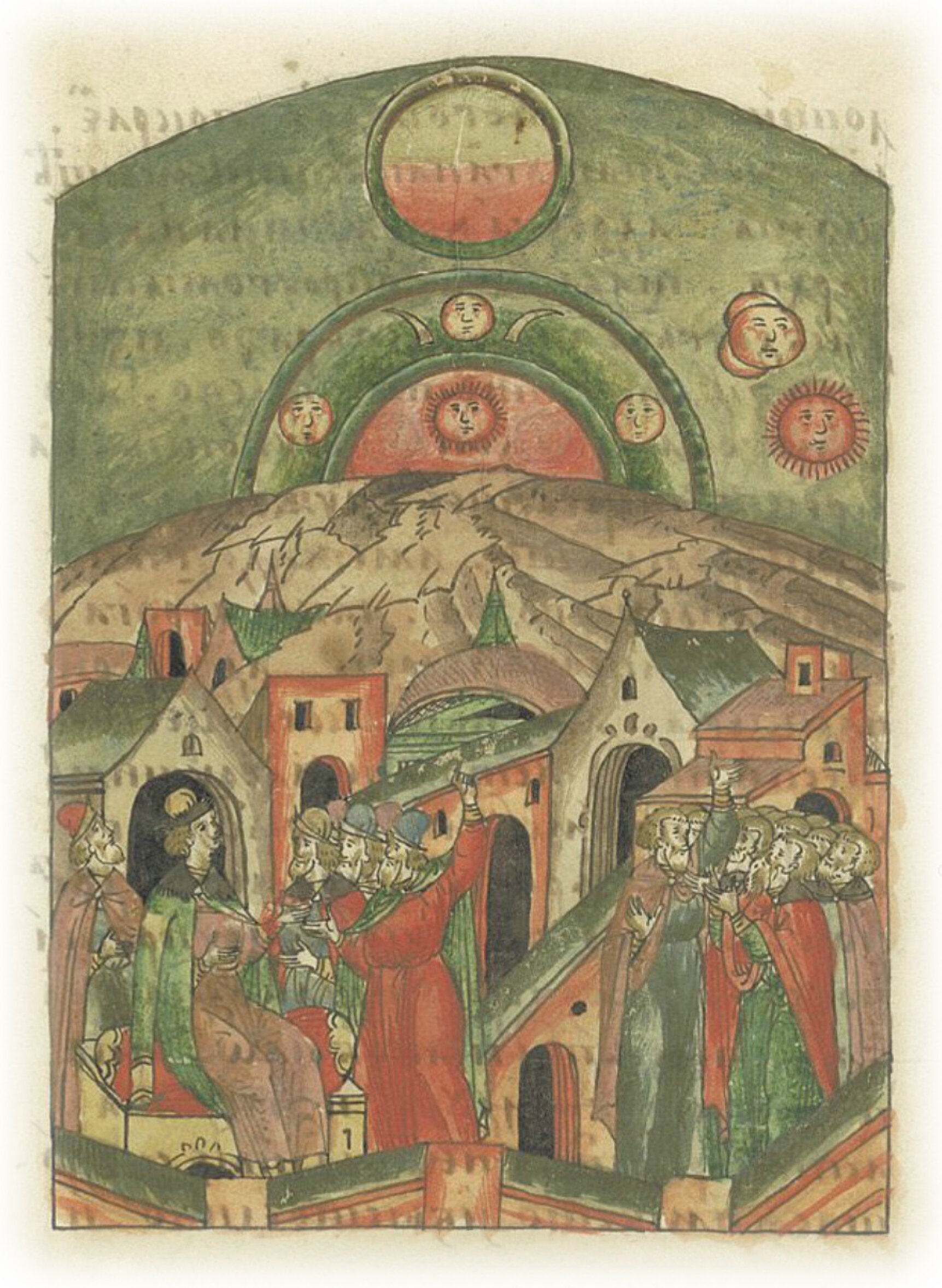 Знамение. В 6978 (1470) году месяца апреля в 15 день, в неделю Цветную, после вечерни в 12 часов дня было знамение в солнце: явился круг на небе, одним краем посреди неба, а другой спустился к западу; та половина того круга, которая к западу – изнутри была красная, а вокруг – зеленая; а половина круга того, который вверх, по краям, как бывает дуга на небе – тем же цветом; а другая половина, которая вверх – та белая. А под тем кругом две дуги тем же образом: снаружи зеленые, а внутри красные. И до самого запада концы дуг тех (доходили), и на середке солнце уже ближе к западу склонилось. А меж дуг, под самым кругом, как будто между двумя рогами, один из которых был концом на юг, а другой – на север, было светло, будто солнце сияло, а стояло (это светило) прямо над настоящим солнцем. И вниз от того солнца, меж рогов по обе стороны еще одно солнце, против настоящего солнца. И так два часа было видно, и потом круг и дуги исчезли. А те три необычные солнца сошлись вместе, и стало как одно, и оно шло за настоящим солнцем, чуть повыше его; и зашли вместе: сначала настоящее, а за ним то необычное. Около круга, который был краем посреди неба, по обе стороны его, чуть повыше, было бело, но вверх не поднималось, а спускалось вниз до полукруга концов их. Это же знамение видели многие в Москве. В прочих же городах, говорят, никто того не видел нигде.