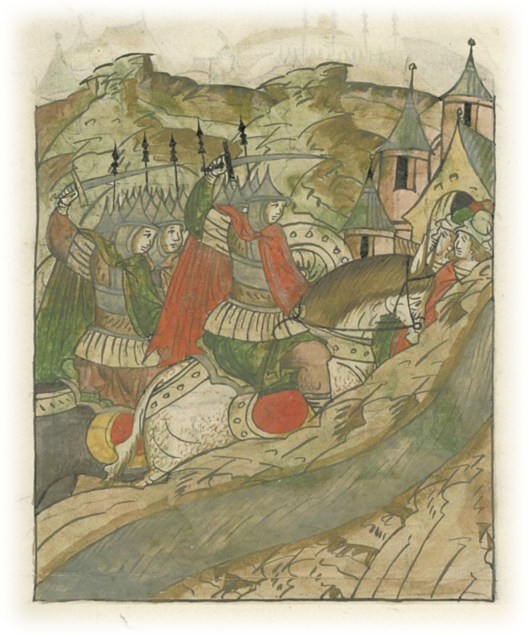 Языки говорят воеводам царя Ивана Васильевича, что магистр окопался большим рвом вокруг города Рындола, бьет из пушек и пищалей и приступает к Рындолу.