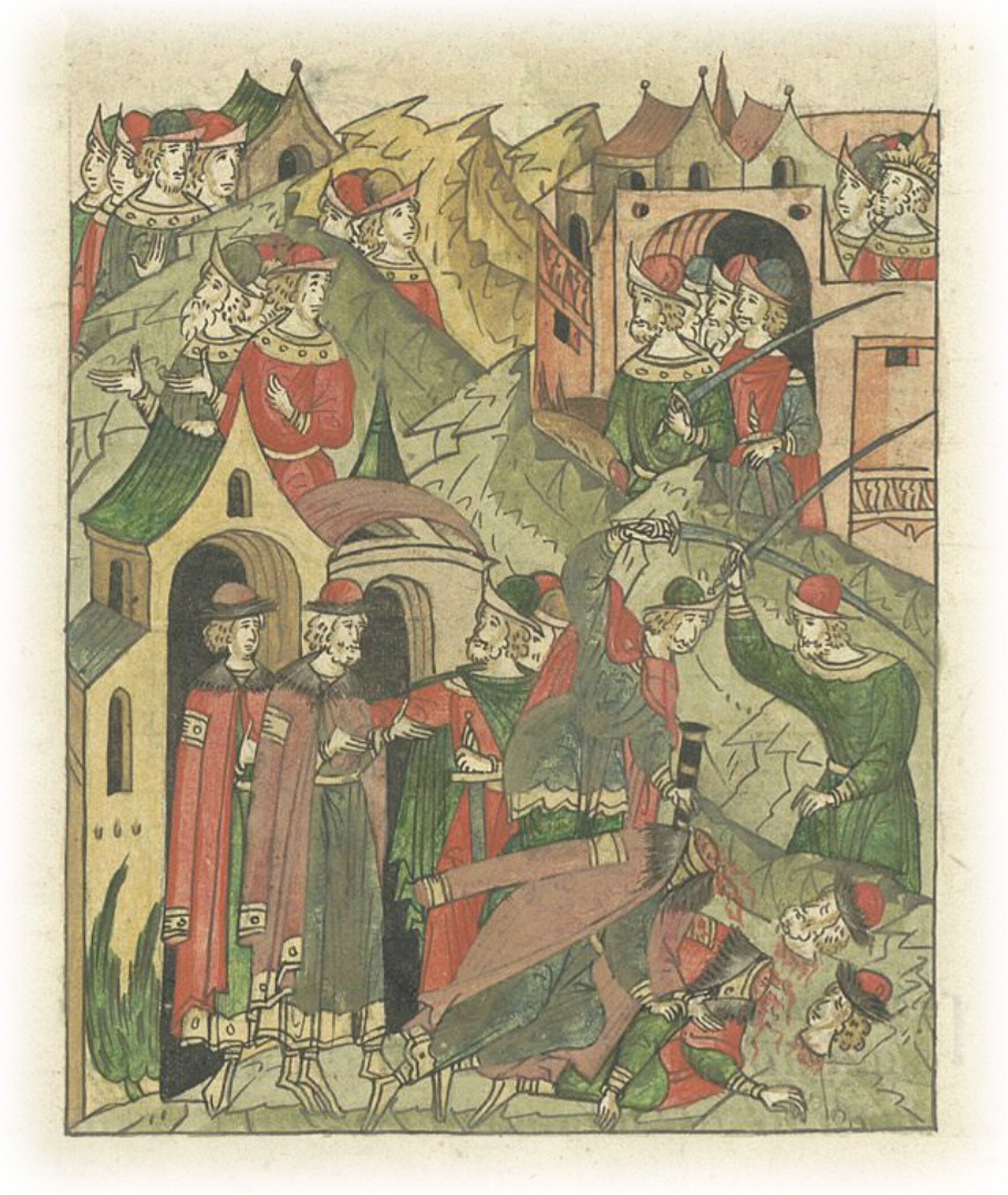 Убийцы, посланные царем Азбяком, отрубают головы князю Александру Михайловичу Тверскому и его сыну Федору. Бояре и слуги разбегаются.