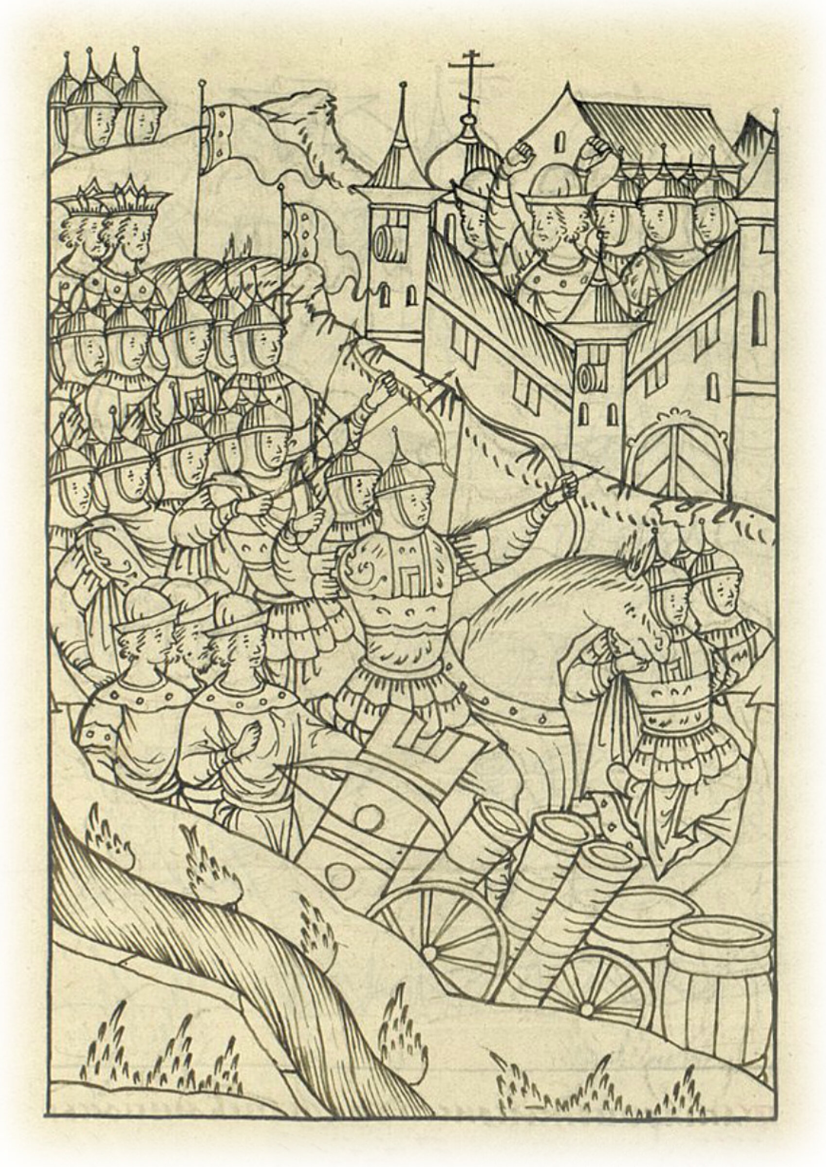 А войску велел приступать к городу с пушками и с пищалями, и градобитными орудиями. А в городе в ту пору был воевода великого князя Василий Жулебин, правнук литовского князя Остея, из рода Свиблов, с немногими людьми, а другой воевода – Александр Кобяков из рязанских бояр.