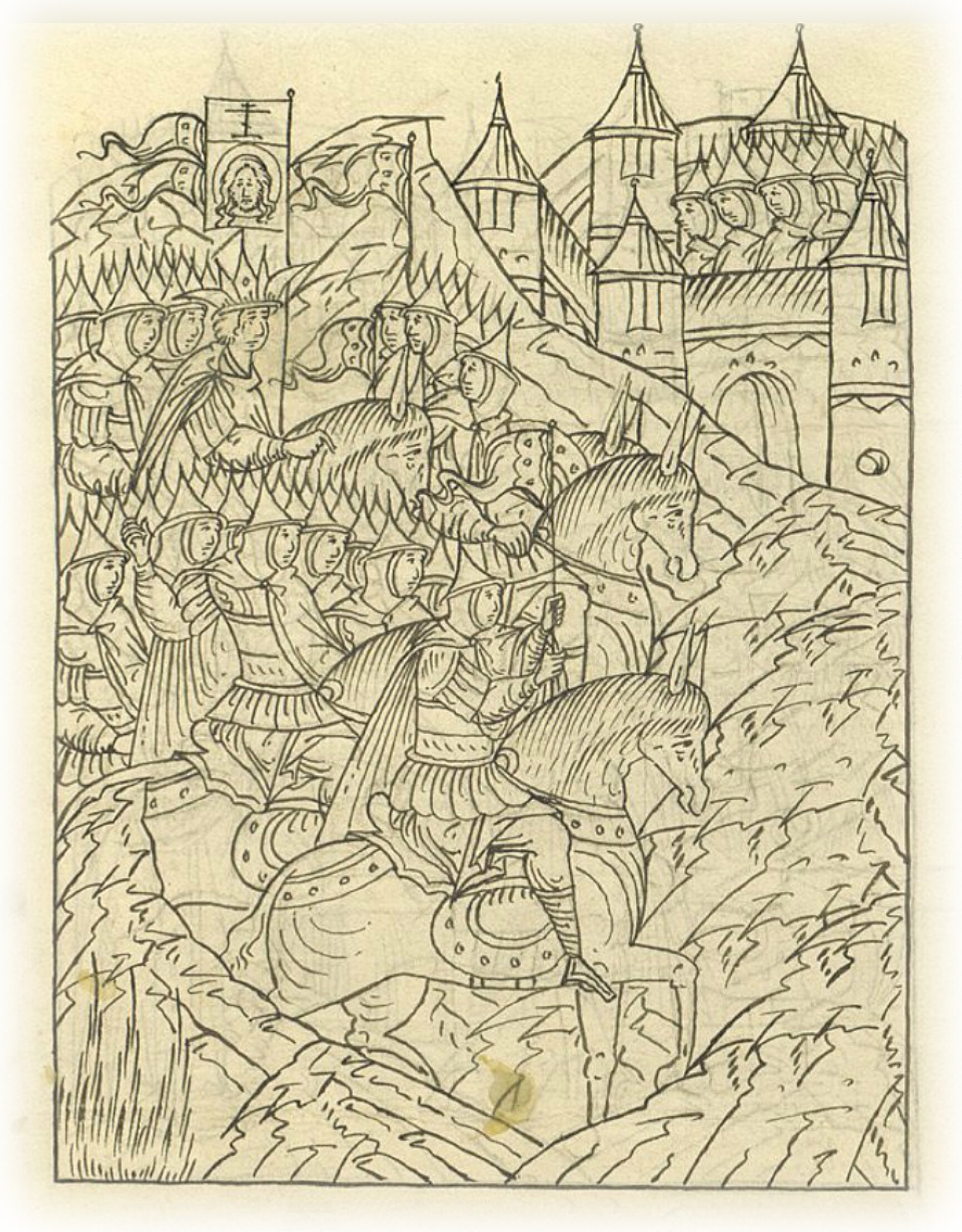 И как государь вышел на луг против города, то велел государь развернуть хоругви христианские, то есть знамена, на которых Нерукотворный образ Господа нашего Иуса Христа, и наверху водружен животворящий крест, который был у прародителя его, государя нашего, достохвального великого князя Дмитрия, на Дону,