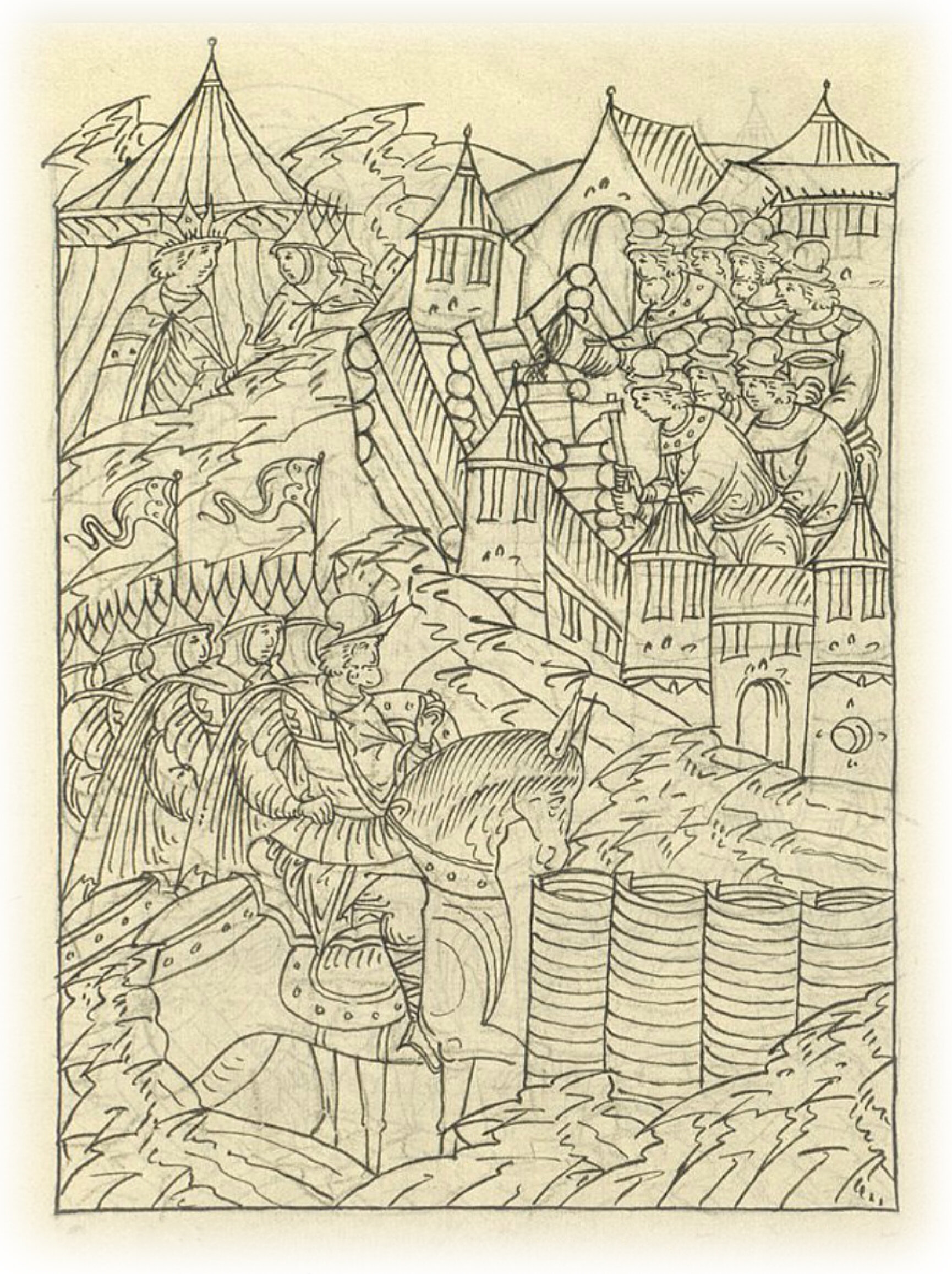 Языки говорят воеводам царя Ивана Васильевича, что магистр окопался большим рвом вокруг города Рындола, бьет из пушек и пищалей и приступает к Рындолу.