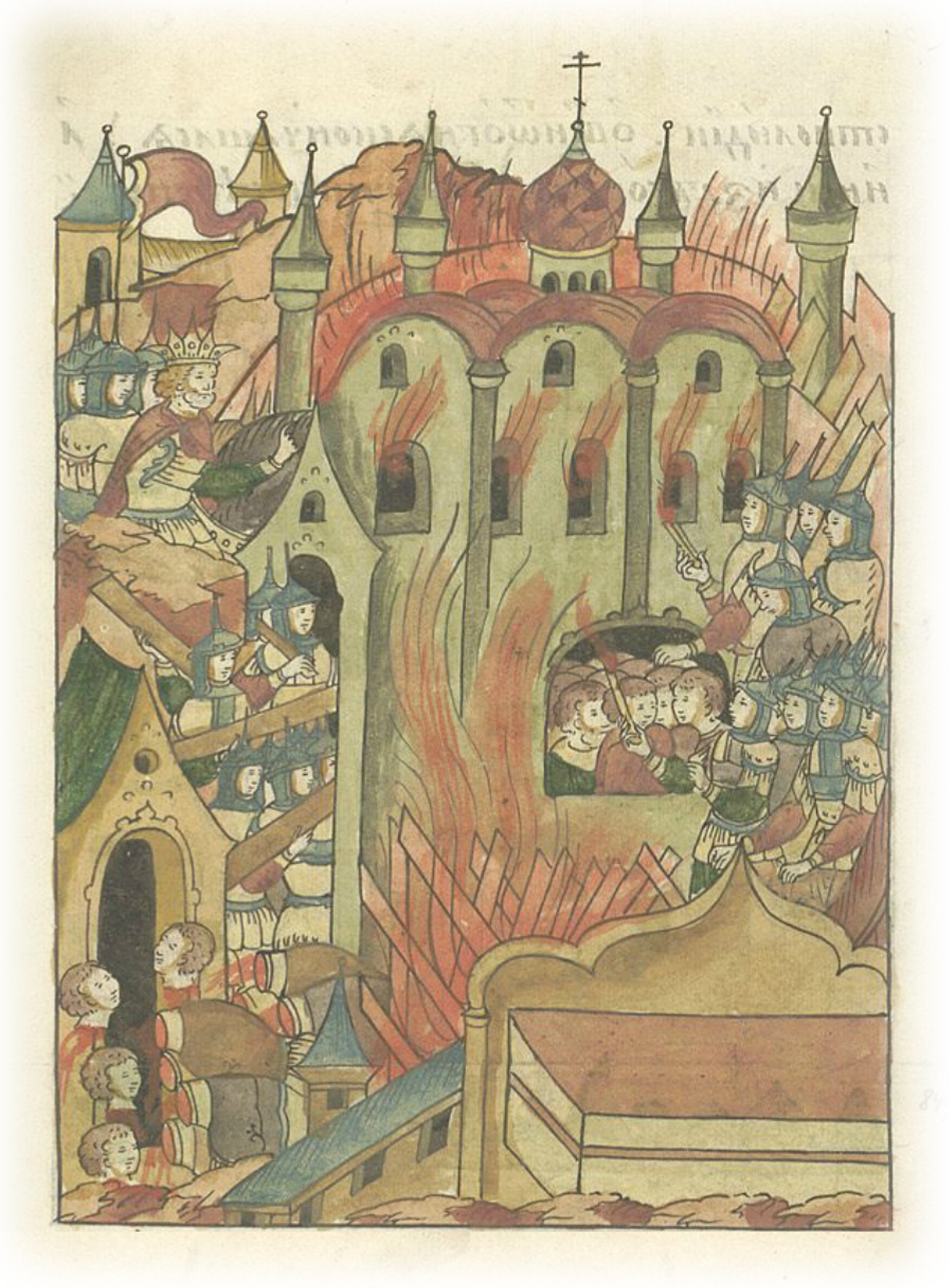 Батыево нашествие в 1237 году. На 25 год после преставления великого князя Дмитрия Всеволода за грехи наши навел Бог безбожного царя Батыя пленить Русскую землю. Взяли они славный город Владимир и соборную церковь, все вокруг нее и внутри обложили деревом и подожгли. А там было множество людей, и одни от огня скончались, другие – задохнулись, а остальные были посечены.