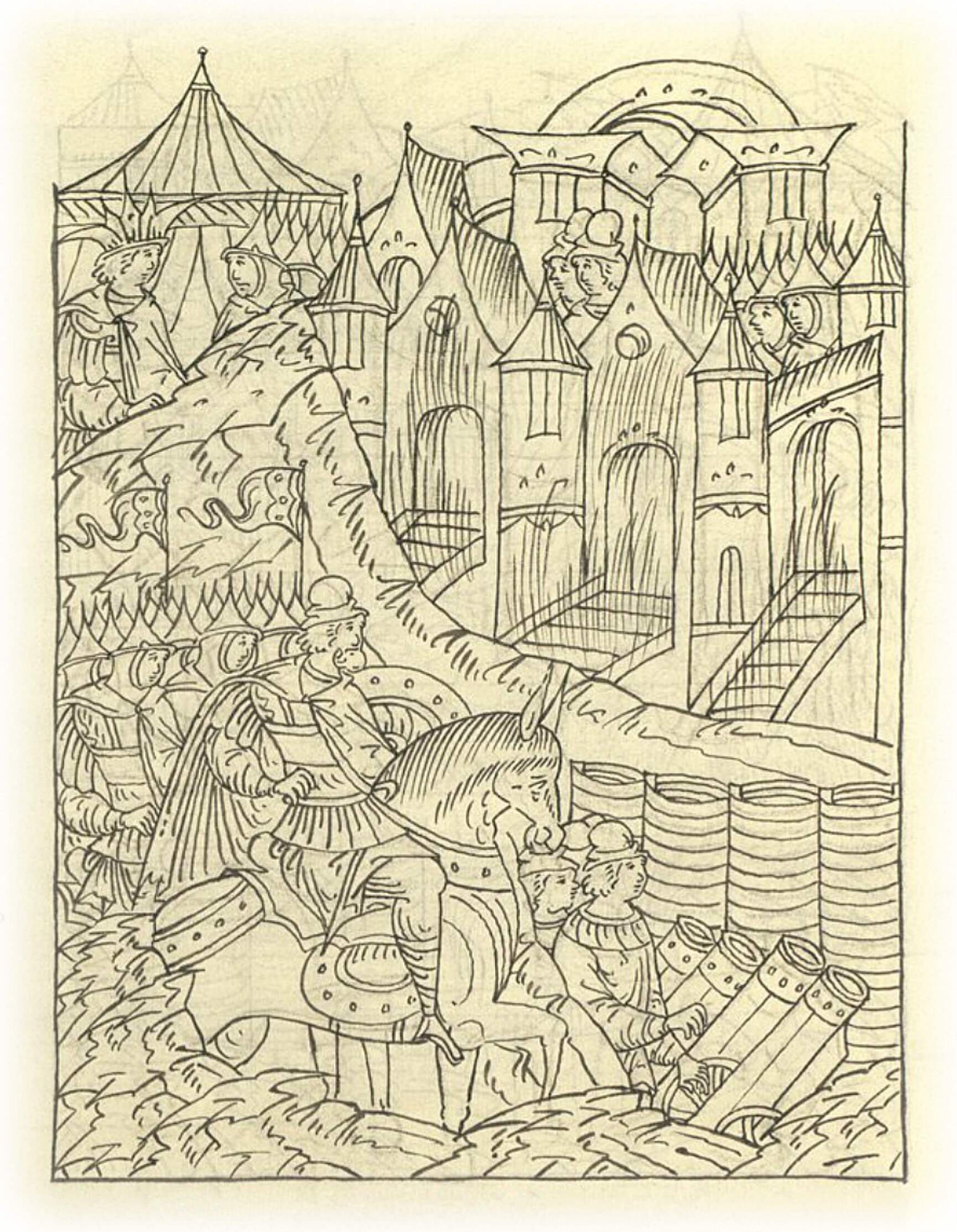 Языки говорят воеводам царя Ивана Васильевича, что магистр окопался большим рвом вокруг города Рындола, бьет из пушек и пищалей и приступает к Рындолу.