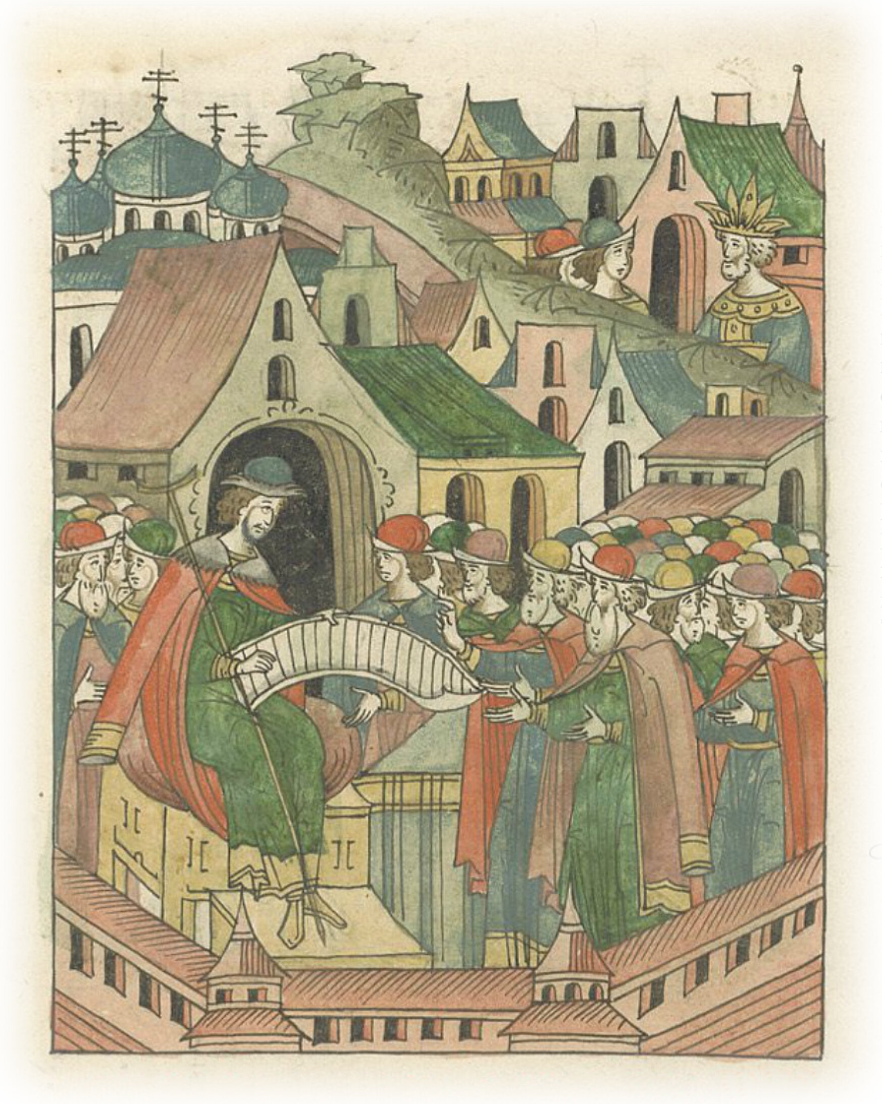 Начало государства великого князя Василия Ивановича. Великий князь Василий Иванович смотрит клятвенные грамоты царя Менли-Гирея о дружбе и братстве с детьми великого князя Ивана Васильевича.