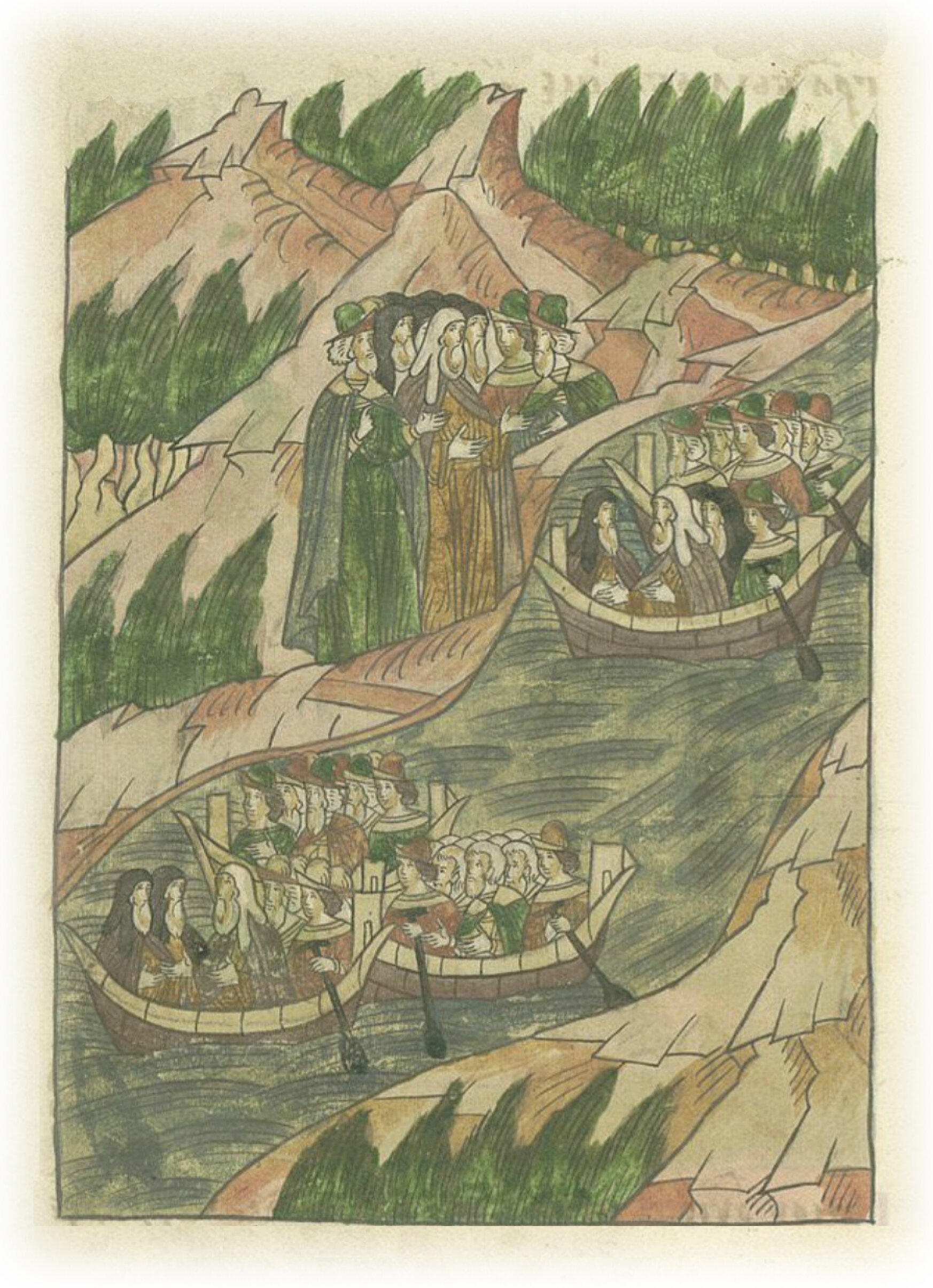 Мы же в неделю святых Мироносиц оттуда с Пименом митрополитом все пошли: Михайло, епископ Смоленский, и Сергий, архимандрит Спасский, и протопопы, и протодьяконы, и священники, и иноки, и слуги; влезли в суда и поплыли рекою Доном вниз по течению.
