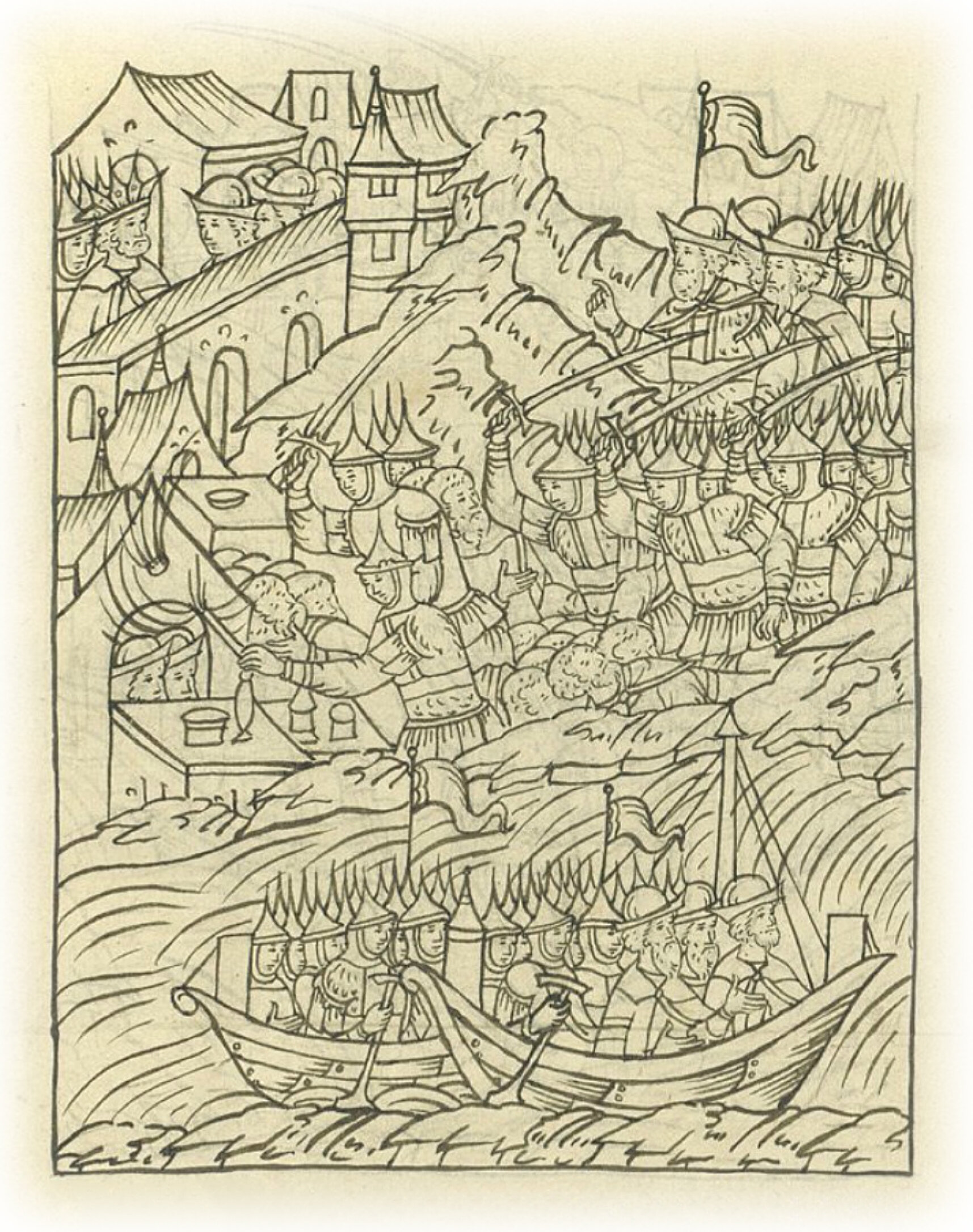 Языки говорят воеводам царя Ивана Васильевича, что магистр окопался большим рвом вокруг города Рындола, бьет из пушек и пищалей и приступает к Рындолу.