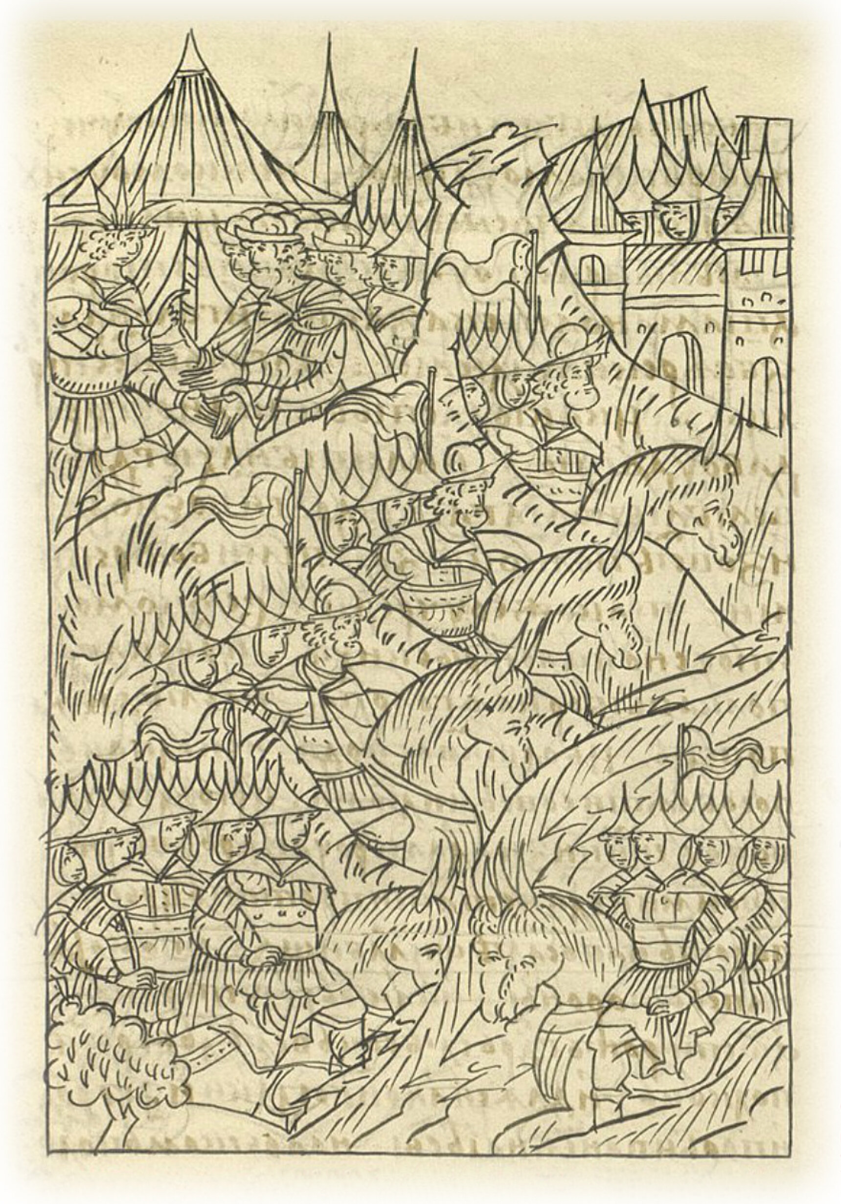 О раздумьях воеводских для приступа к городу. И после этого благочестивый царь повелел всем людям готовым быть в полках, готовясь приступать к городу. И отобрал множество воинства своего, и повелел всем боярским людям головы назначить, как прежде было описано, выборных детей боярских и наученных ратному делу, всякому сыну боярскому – по сто человек. И впереди велел приступать со всех сторон атаманам с казаками и головам с боярскими людьми да головам со стрельцами. И как, даст Бог, когда люди у города будут и на стенах, государь велел помогать другим воеводам из всех полков с детьми боярскими. Также учредил всякой сотне сынов боярских царского полка выборную голову; затем повелел большим воеводам из полков помогать им со всеми людьми. Царь благочестивый и с ним князь Владимир Андреевич со своими полками должны стоять против Царских ворот на посаде у кладбища и помогать на все стороны, и как Бог устроит. А со стороны леса государь велел беречь полки. А на случай вылазки казанцев из города и ухода их в леса на Арском поле и на дорогах арских и на чувашских велел государь быть царю Шигалею; а с ним быть всем князьям и мурзам городецким, да боярину и воеводе князю Ивану Федоровичу Мстиславскому со своим полком, да горным людям велел с ними же быть. А на Ногайской дороге велел государь быть боярину князя Владимира Андреевича князю Юрию Оболенскому с полком, да голове с дворянами своего царского полка князю Григорию Федоровичу Мещерскому. А на Галицкой дороге за Казань-рекою, близ Бежболды, велел государь быть воеводе своему князю Ивану Ромадановскому с людьми, да воеводе князя Владимира Андреевича Ивану Угримову Заболоцкому; да за Казань-рекою велел быть голове с дворянами своего же царского полка Михаилу Ивановичу Вороному; а вверх по Казани у Старого городища – голове Михаилу Петрову Головину.
