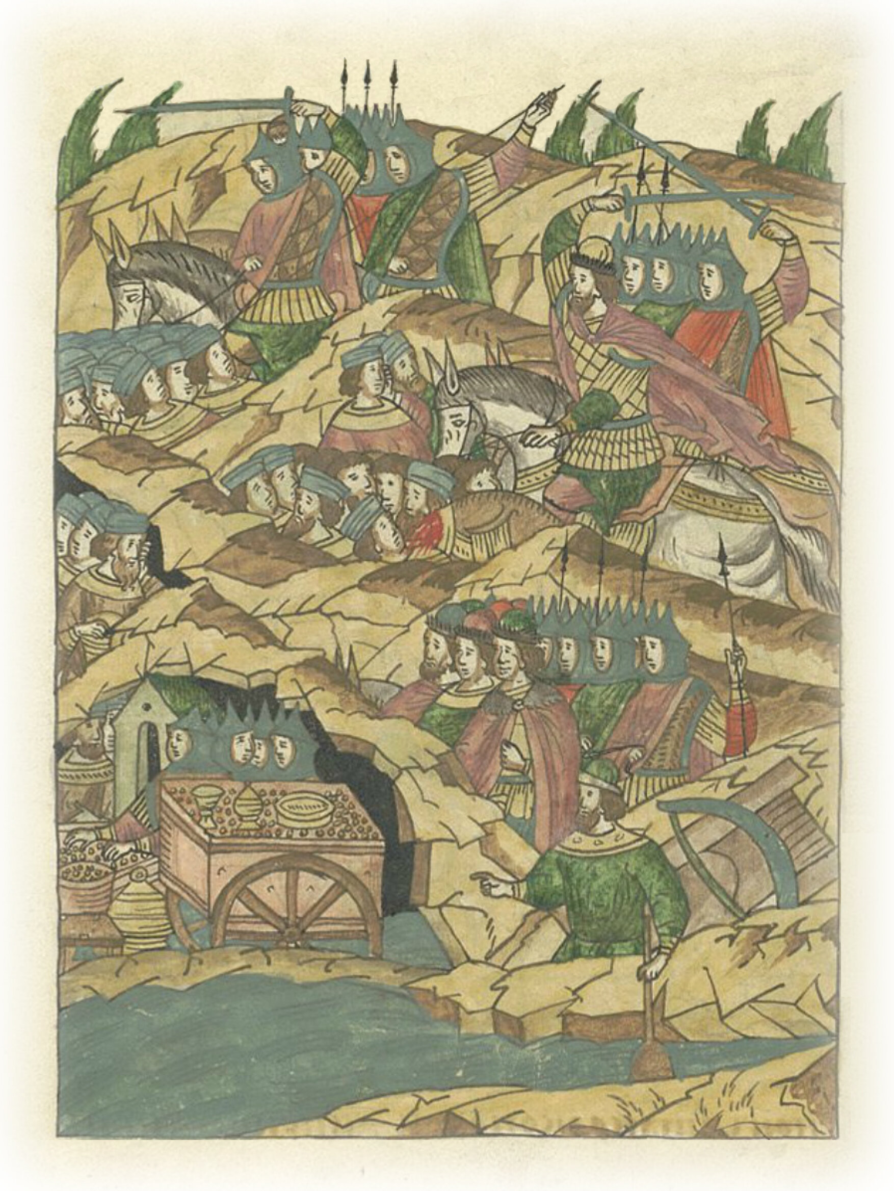 Мастер же осадный хитростью пустил на них воду, они же выбежали из пещеры, и так их всех иссекли, а богатство их всё взяли.
