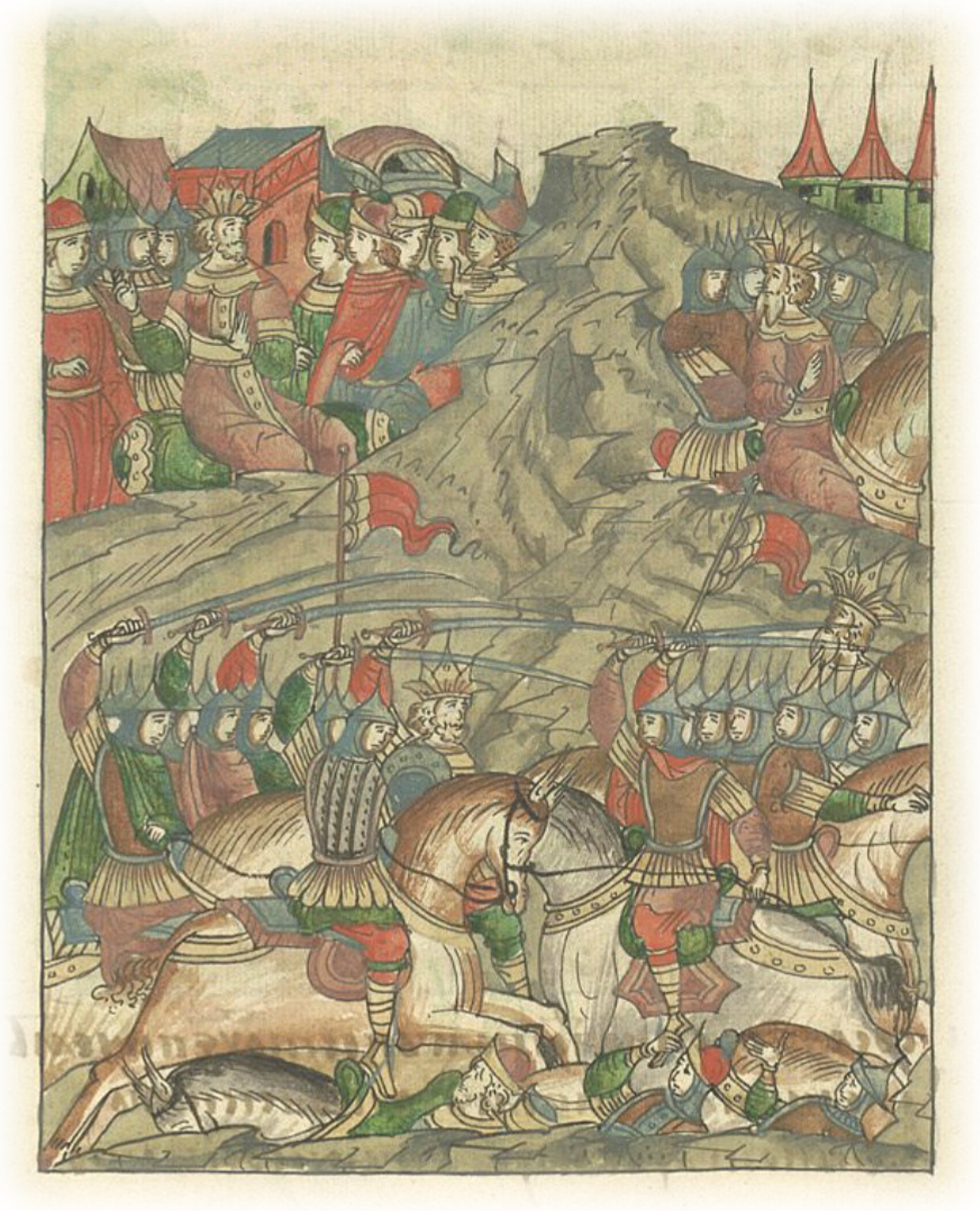 И тут внезапно напал на него некий царь именем Темир-Кутлуй, и был бой между ними великий и сеча злая. И одолел царь Темир-Кутлуй царя Тохтамыша и прогнал его, а сам сел на царство Волжской Большой Орды, а царь Тохтамыш побежал к Литовским странам.
