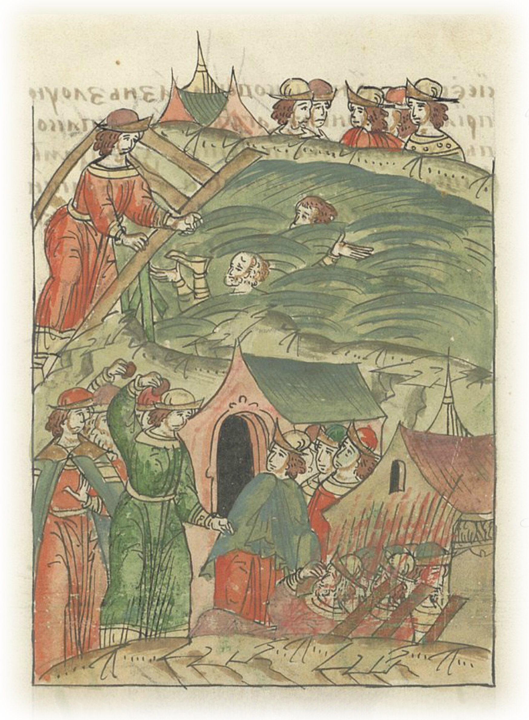 Тогда же от скорби после того пожара новгородцы схватили напрасно многих людей, говоря: «Вы тайно поджигаете ради своей корысти и причинили такие беды и напасти!» И многих христиан в огне сожгли, а других в Волхов с моста сбросили, а других камнями побили. Тайну сердец человеческих один Бог знает, по правде ли произошло то, что такую злую смерть приняли, так как такие беды бывают за наши грехи, чтобы люди отказались от злых своих дел и покаялись, и по воле Божьей жили, чтобы в настоящем и в будущем благо бы получили.
