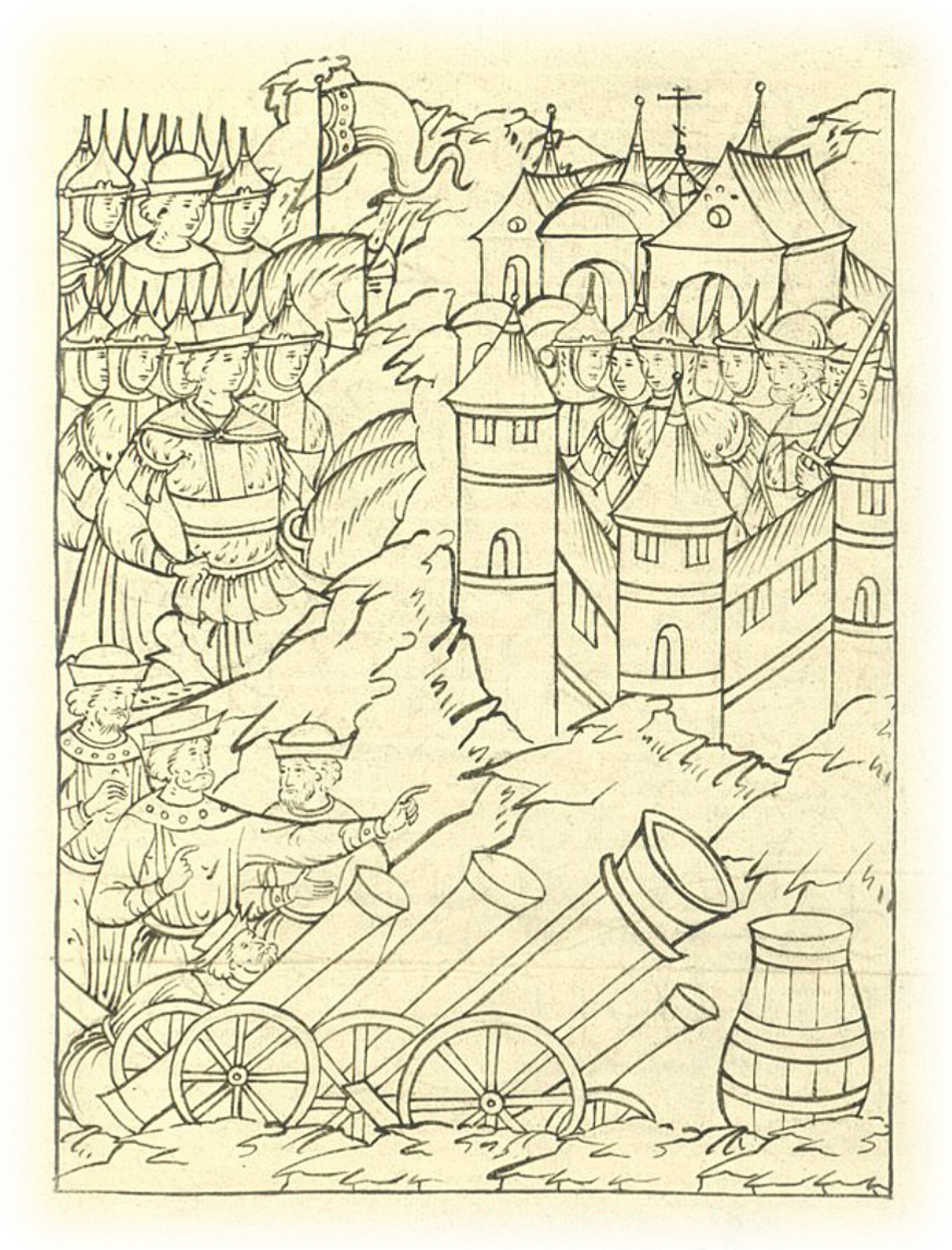 Языки говорят воеводам царя Ивана Васильевича, что магистр окопался большим рвом вокруг города Рындола, бьет из пушек и пищалей и приступает к Рындолу.