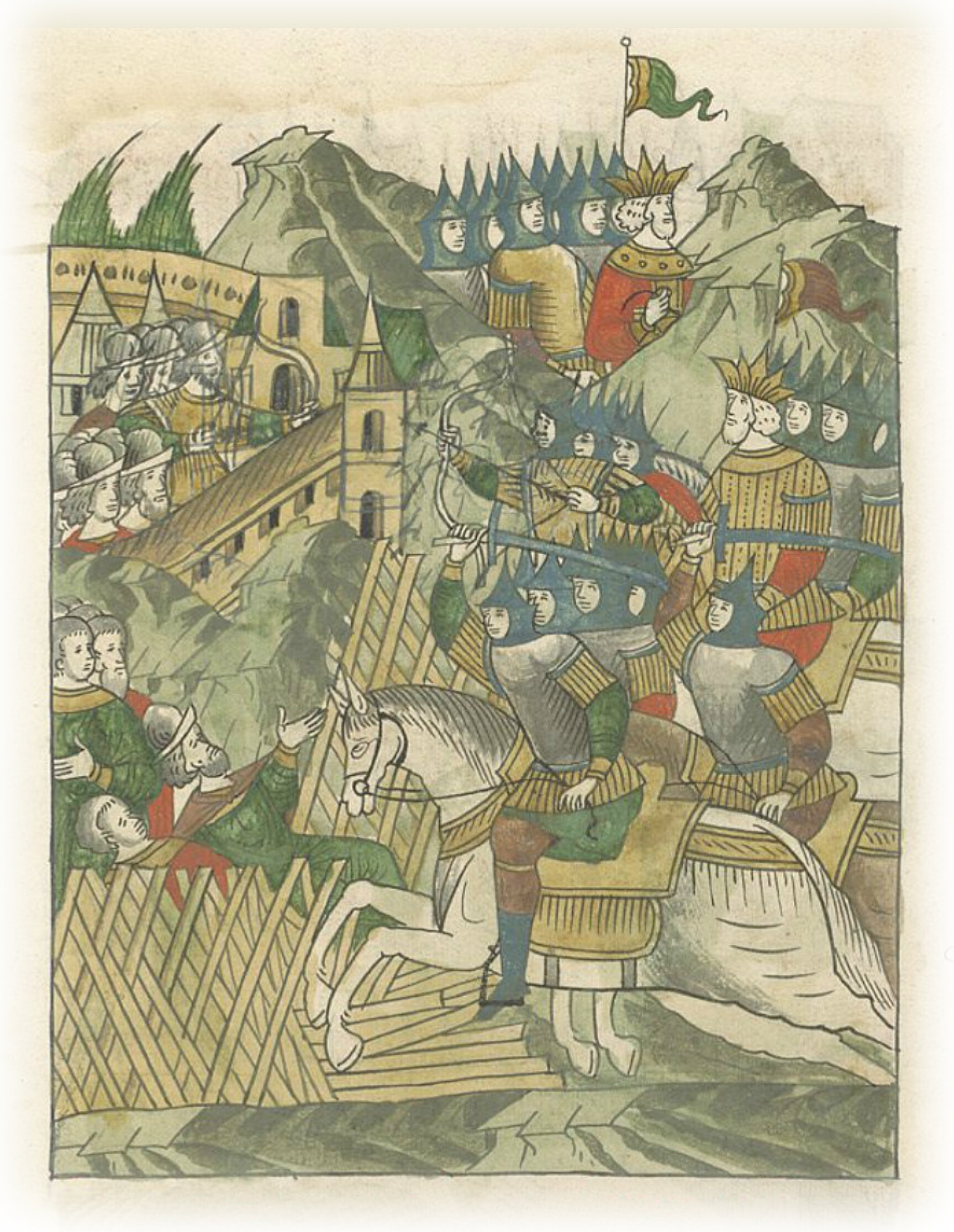 Языки говорят воеводам царя Ивана Васильевича, что магистр окопался большим рвом вокруг города Рындола, бьет из пушек и пищалей и приступает к Рындолу.