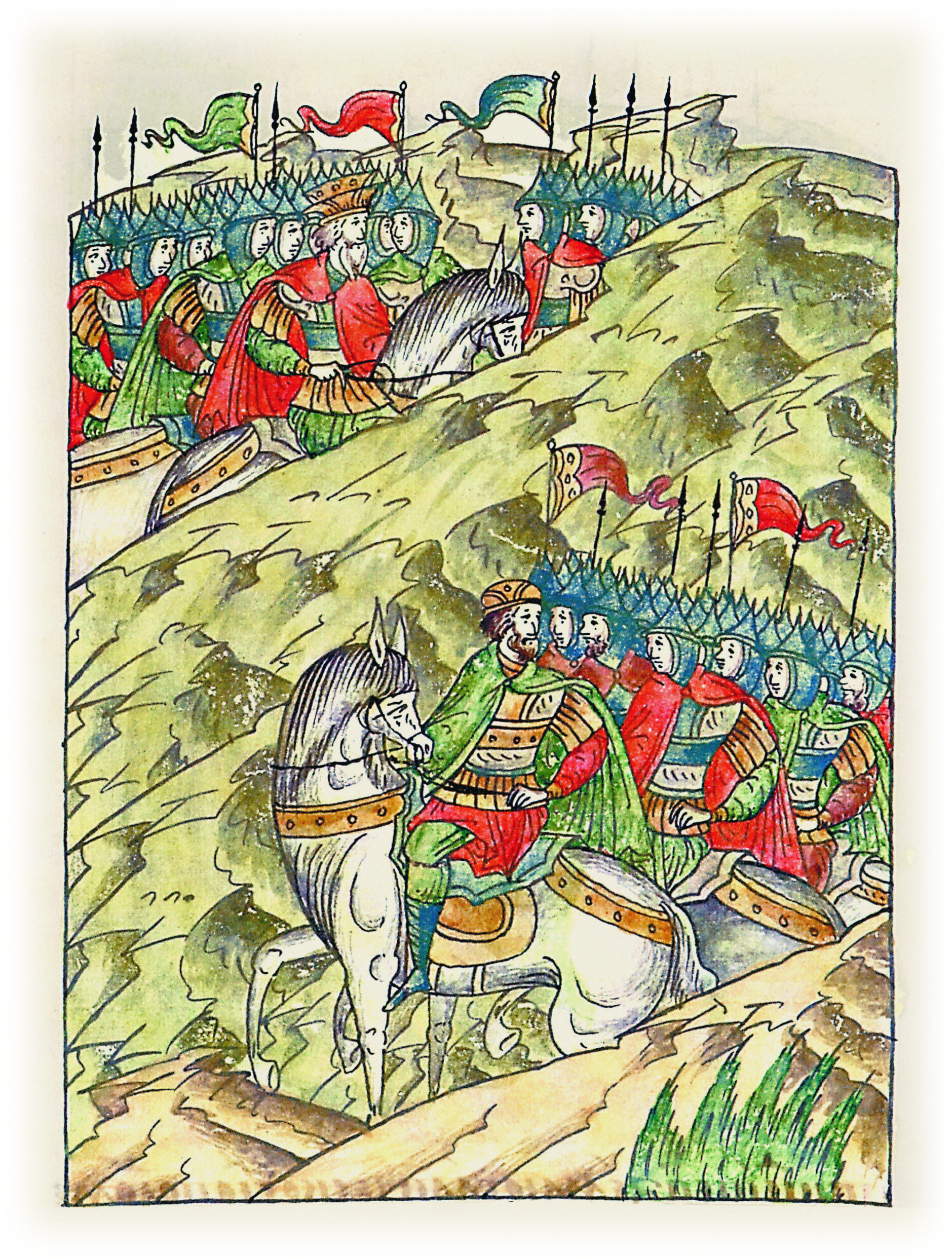 Утром же, встав, король пошел, а Владимир отступил назад за гору и встал; и так король начал полки свои ставить на бродах, галичане же ставили напротив них свои полки и не могли стоять против короля.