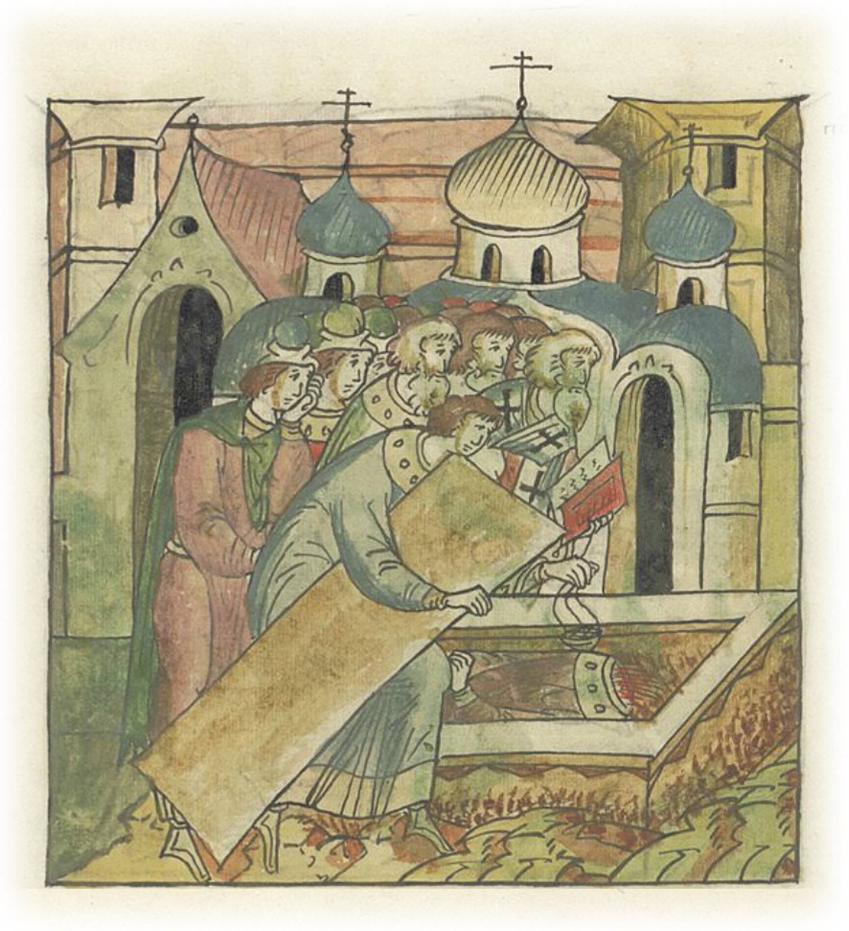 И отпев над ним обычные песнопения, положил его в гроб в церкви святой Богородицы со многими слезами. Головы же его не нашли среди многих трупов мертвых.