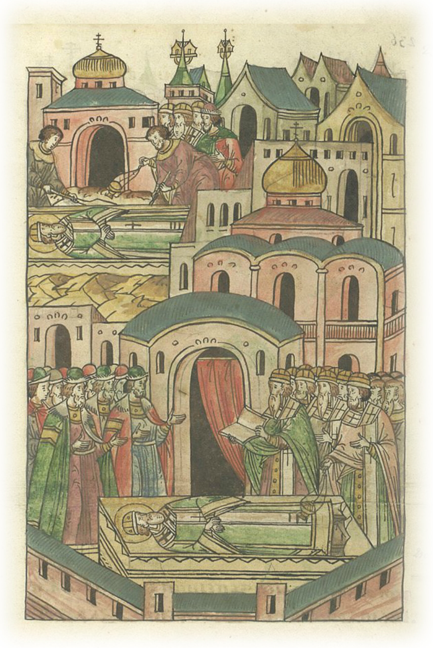 И там снова пели над ним и служили все епископы русские со всем священным собором, и погребли его в Киеве, в соборной церкви.