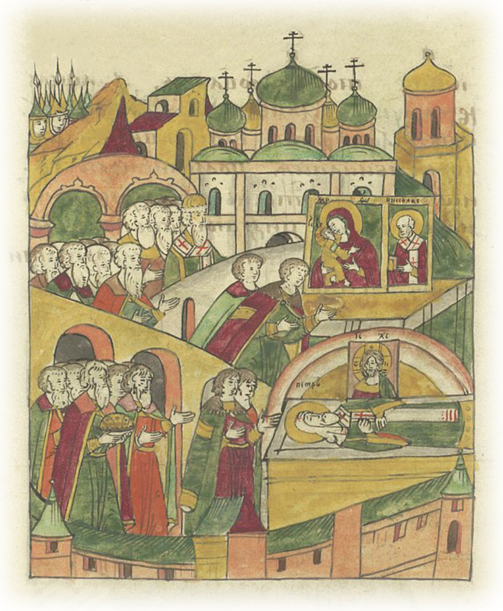 И пошел ко гробу Петра чудотворца с братом своим с князем Юрием, и начал слезы источать и чудотворца на помощь призывать, и сказал: «О чудотворный Петр, призри на нас, сирых! Остались мы от пазухи отца своего и от чресл матери своей малыми, ниоткуда себе на земле утешения не имеем; и ныне пришла на нас великая беда от басурманства; и тебе подобает о нас молиться, а зажег Бог тебя нам как светлую свечу и поставил на свечнице, тебя даровал Бог роду нашему и всему православному христианству как крепкого стража; не оставь нас во время скорби нашей, помолись о нас Богу и о всем роде христианском, пусть избавит нас от нечестивых!» И пошел в церковь, и начал со слезами молиться и прикладываться к святым иконам.