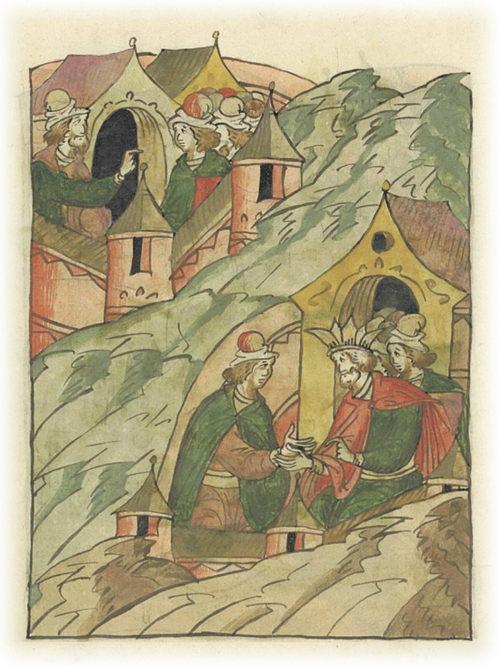 Ругодивские посадники Яким и Захар приезжают в Москву. Воеводы царя Ивана Васильевича Алексей Адашев и Иван Михайлов сообщают им, что государь пожалует их, если сдадут его воеводам помимо Ругодива Вышгород.