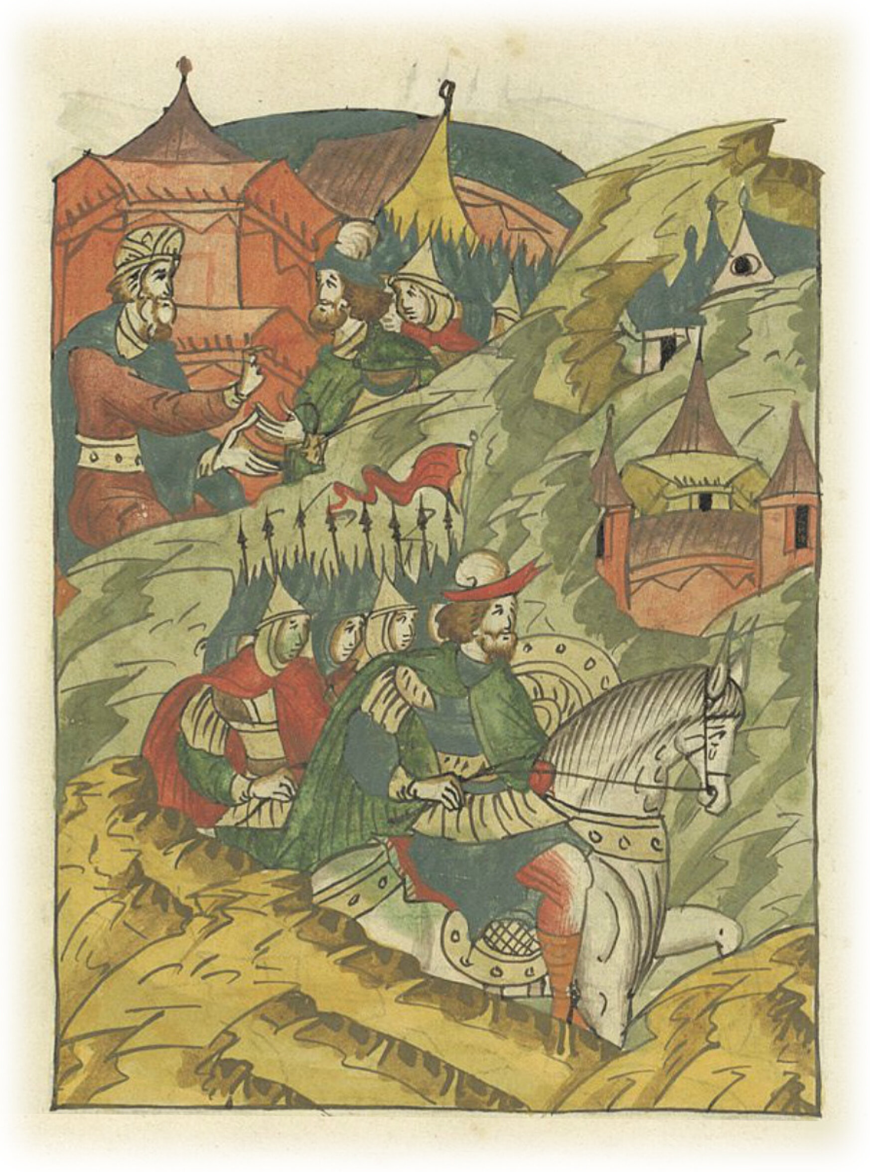 Языки говорят воеводам царя Ивана Васильевича, что магистр окопался большим рвом вокруг города Рындола, бьет из пушек и пищалей и приступает к Рындолу.