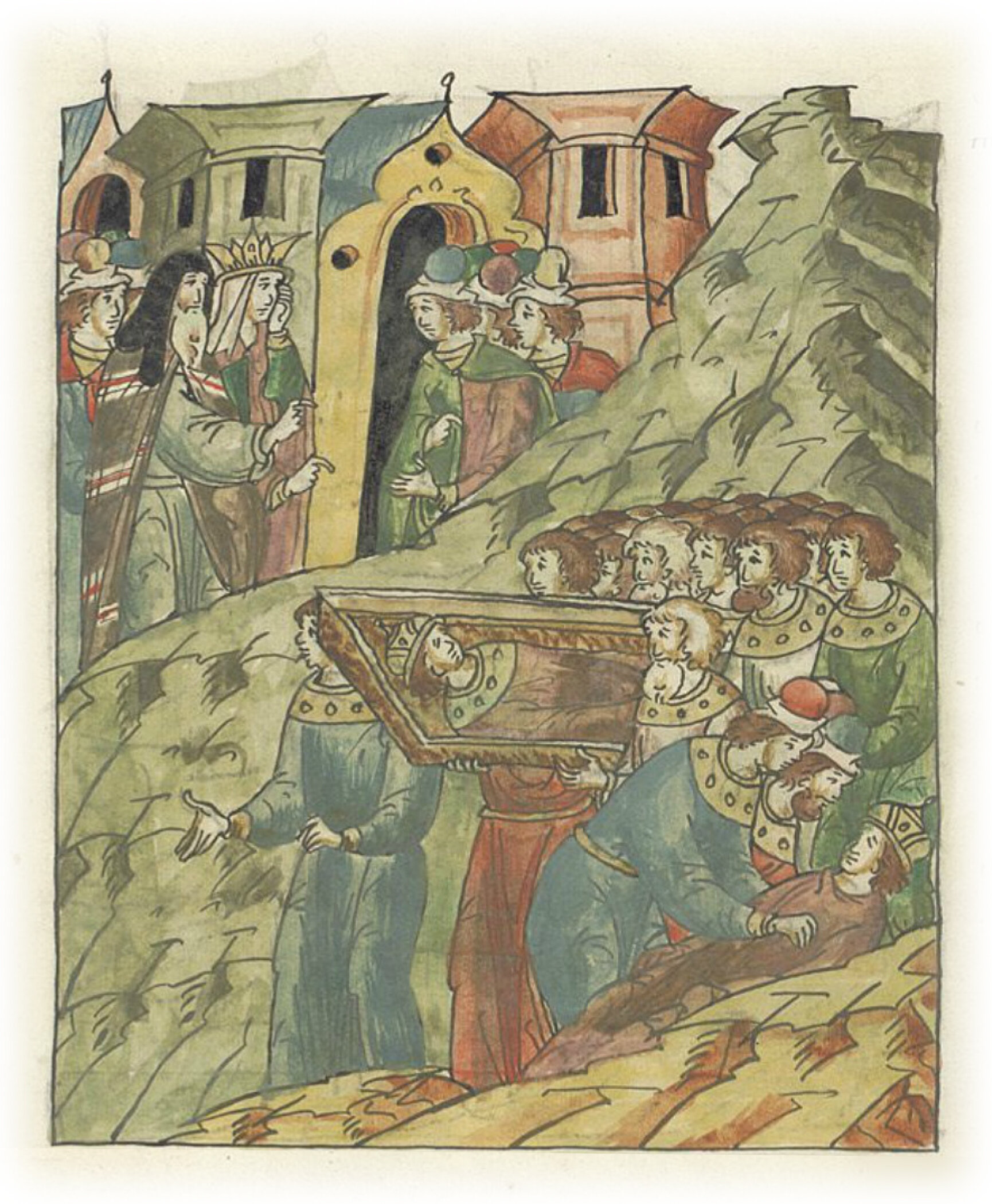 Узнав, где спрятано тело князя Василька Константиновича, епископ Кирилл и княгиня Василька забирают его.