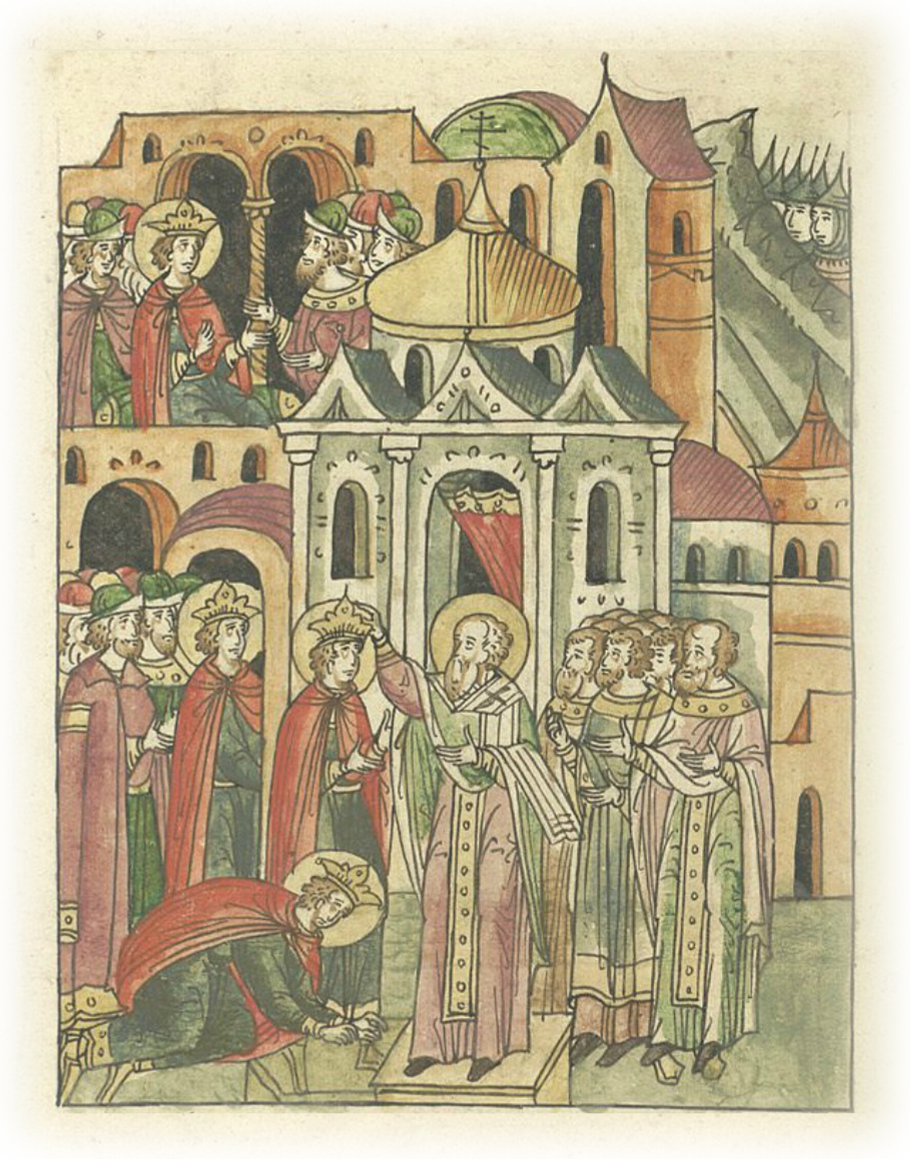 Стефан же сначала пошел и поклонился соборной церкви. И архиепископ Никодим царственным венцом украсил его главу, и всем иллирийским народом венчал его на царство.