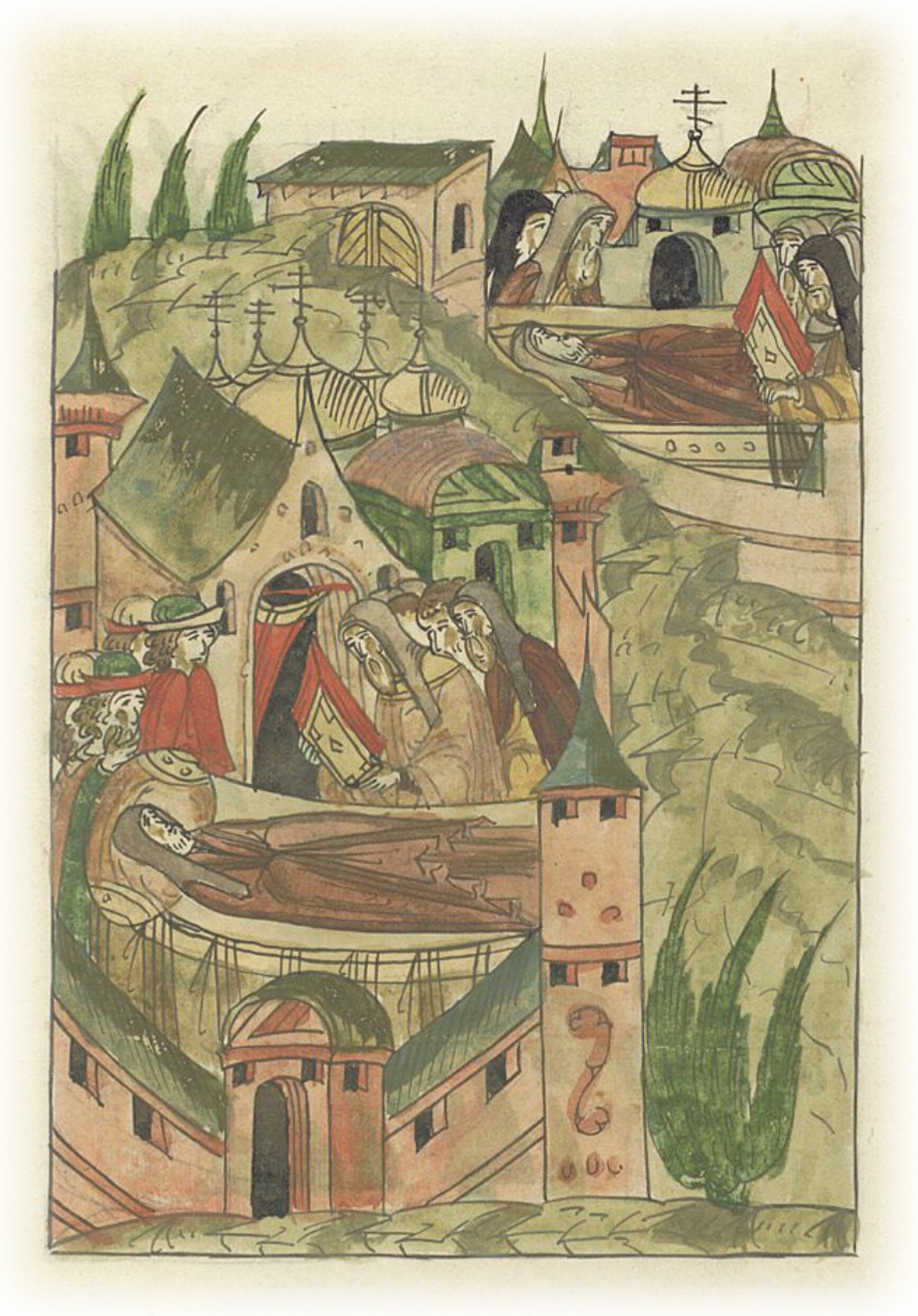 Кончина князя Андрея Владимировича и его похороны у церкви Троицы в Сергиевом монастыре.