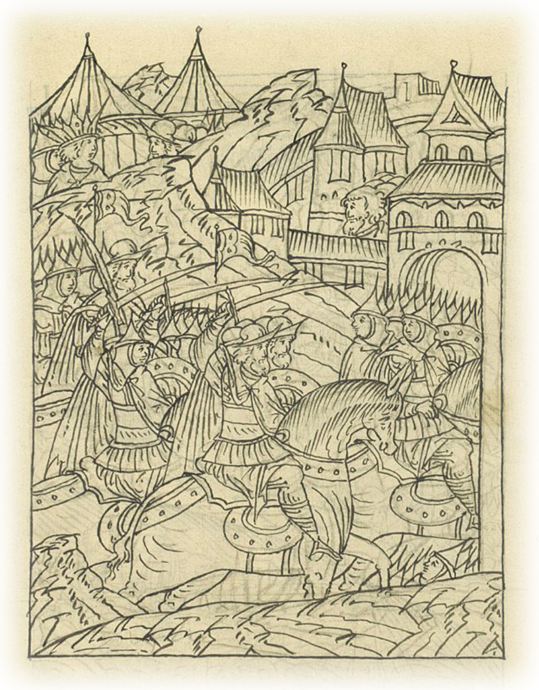 Языки говорят воеводам царя Ивана Васильевича, что магистр окопался большим рвом вокруг города Рындола, бьет из пушек и пищалей и приступает к Рындолу.