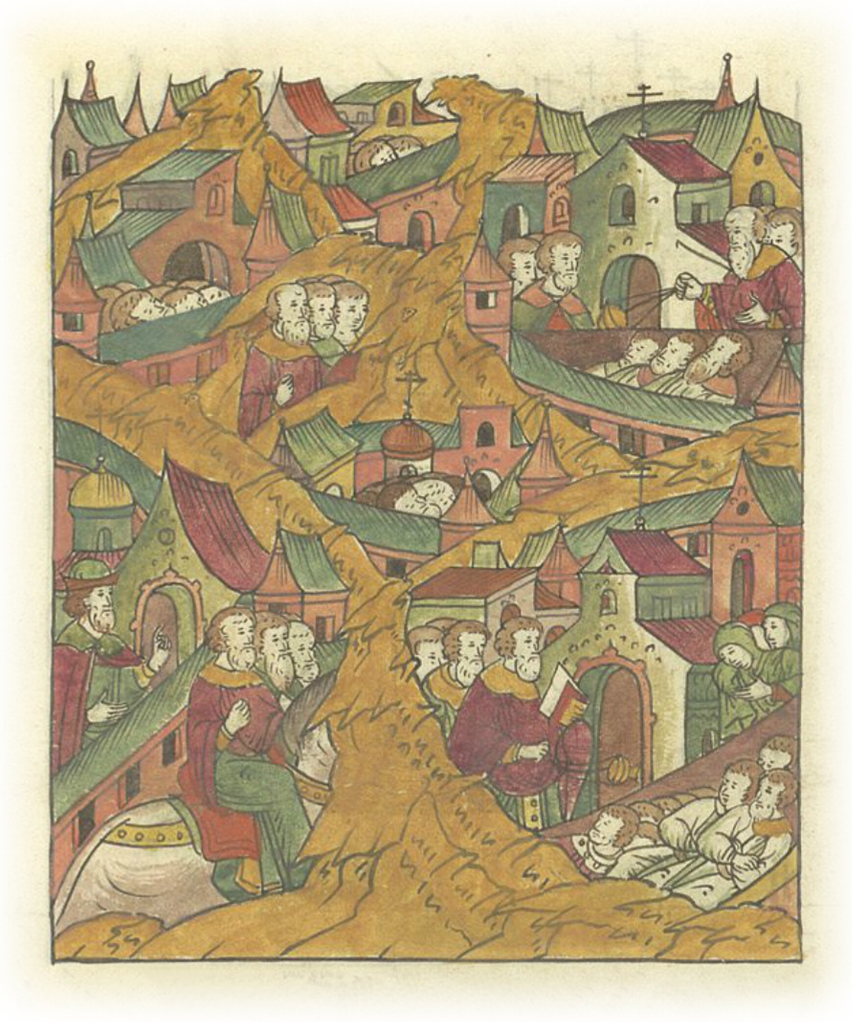 В том же месяце августе явилось моровое поветрие в Великом Новгороде, Полоцке, Озерищах, Невле, Луках Великих, Торопце; и многие люди от язв умирали. В Полоцке же, в Торопце и в Луках на посадах и в уезде попы вымерли. И некому было мертвых погребать; и посланы были попы в те города из иных городов.