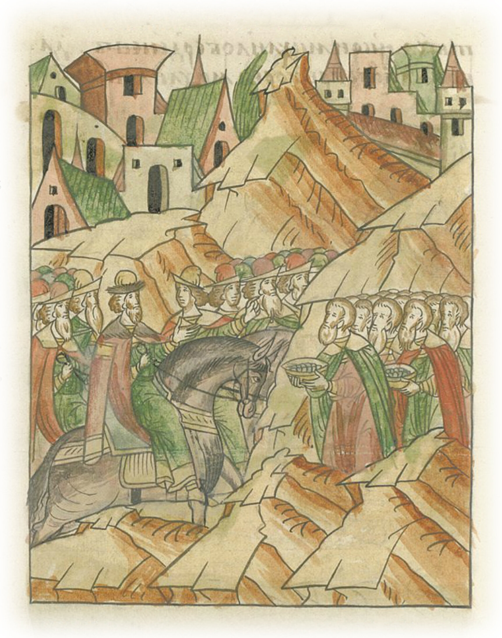 Зажиточные горожане Новгорода встречают великого князя Ивана Васильевича.