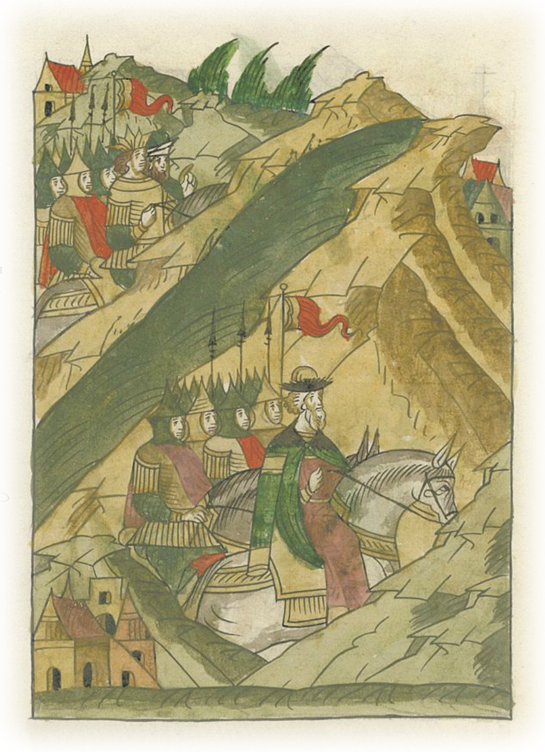 а оттуда шел между Яжелобицкой дорогой и Мстой. А царевичу Даньяру велел идти от Торжка по другому берегу Мсты, а с ним – воевода великого князя Василий Образец Борисович.