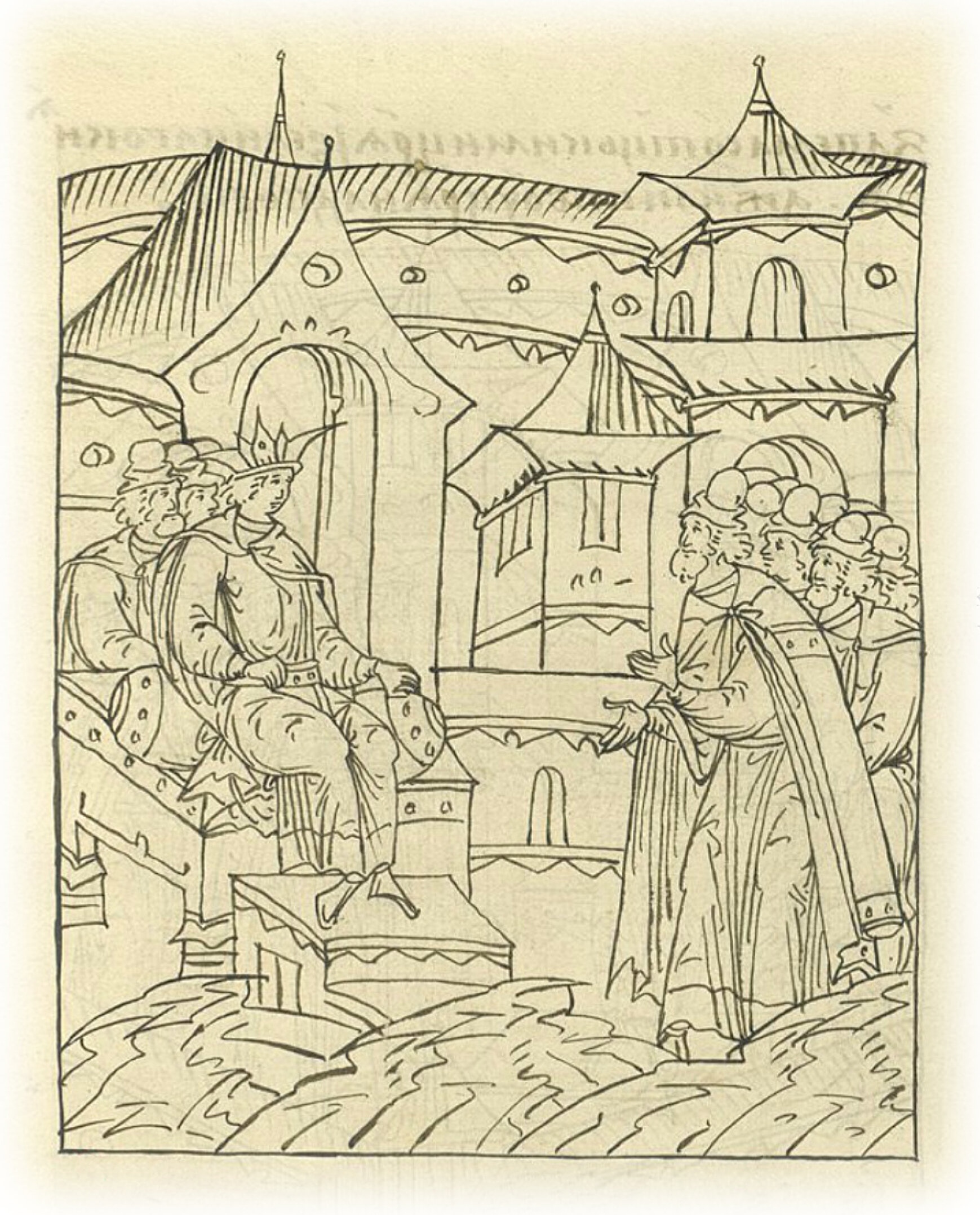 Ругодивские посадники Яким и Захар приезжают в Москву. Воеводы царя Ивана Васильевича Алексей Адашев и Иван Михайлов сообщают им, что государь пожалует их, если сдадут его воеводам помимо Ругодива Вышгород.