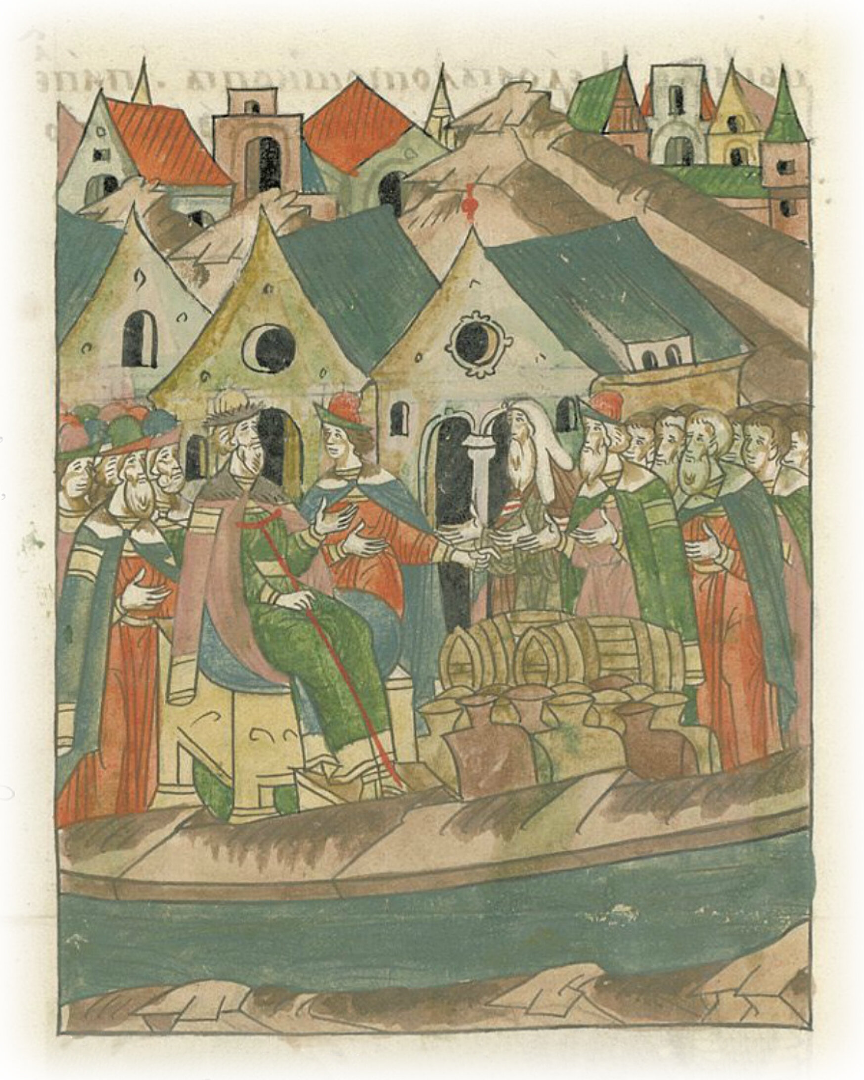 А (выйдя) из Влукова, стоял князь великий в Рыдине на реке на Холове; встретил его на том стане Великого Новгорода архиепископ Феофил от города за сто верст, а с ним князь Василий Васильевич Гребенка Шуйский, да посадник степенной Василий Ананьин, да посадник Иван Афанасов, да посадник Кирилл Яковлев, да тысяцкий степенной Василий Есипов, да Василий Никифоров, да Исаак Семенов Шенкурской, да архимандрит Юрьева монастыря Феодосий, да игумен Хутынский Нафанаил, да игумен Вежицкий Варлаам, да казначей Сергей, да духовник Евфимий; от владыки – две бочки вина, одна красного, а другая белого; а от тех всех – по меху вина.