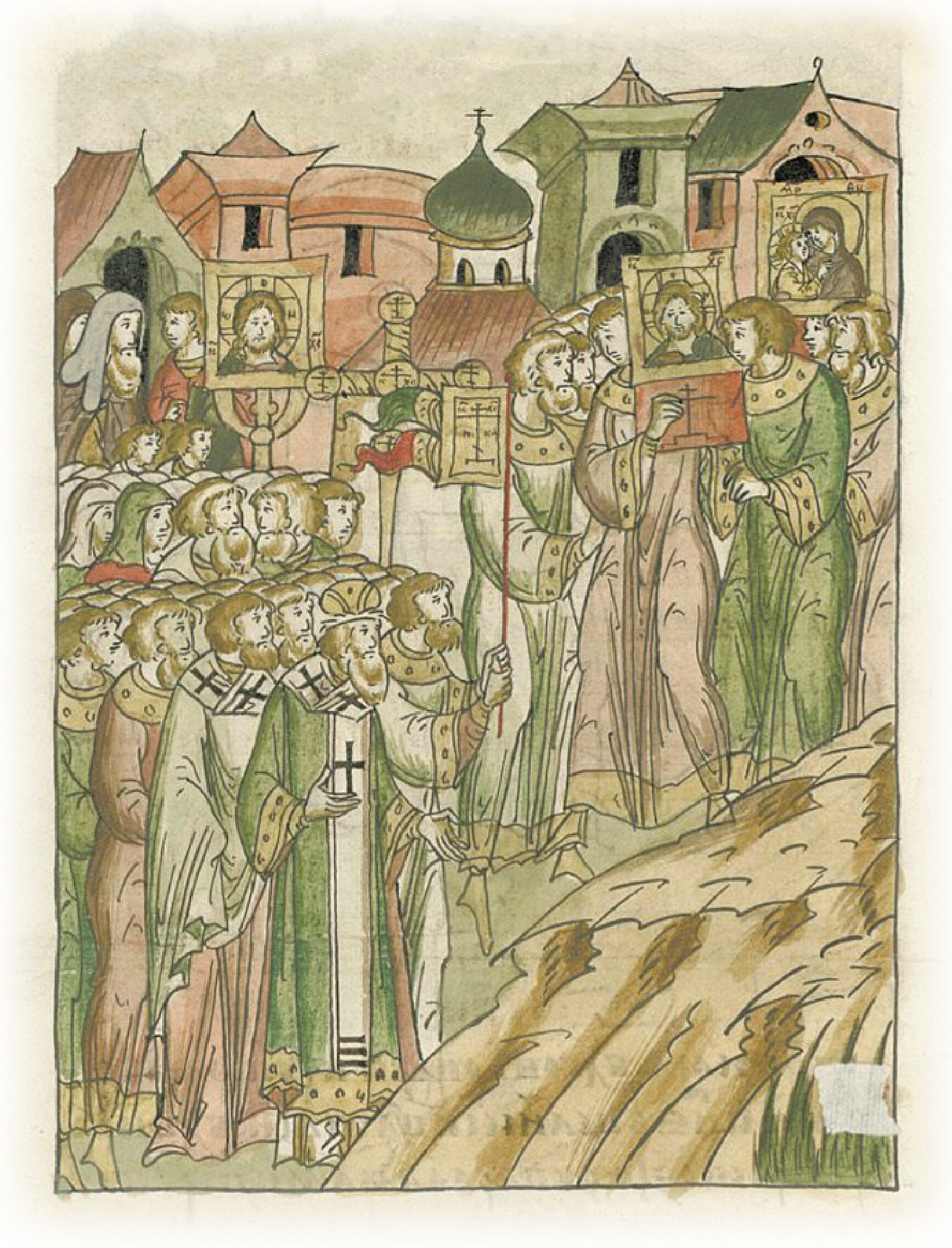 Митрополит всея Руси Варлаам со всем освященным собором встречает владимирские иконы у Сретенского монастыря.