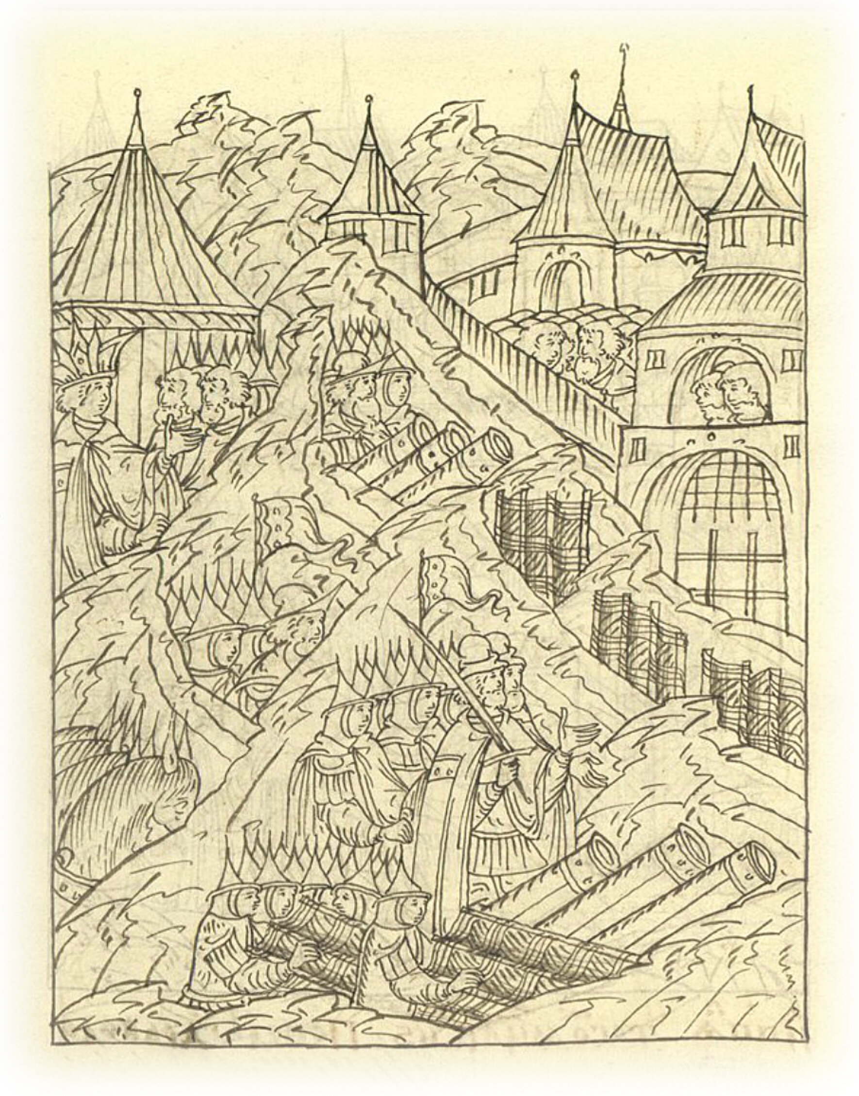 Языки говорят воеводам царя Ивана Васильевича, что магистр окопался большим рвом вокруг города Рындола, бьет из пушек и пищалей и приступает к Рындолу.