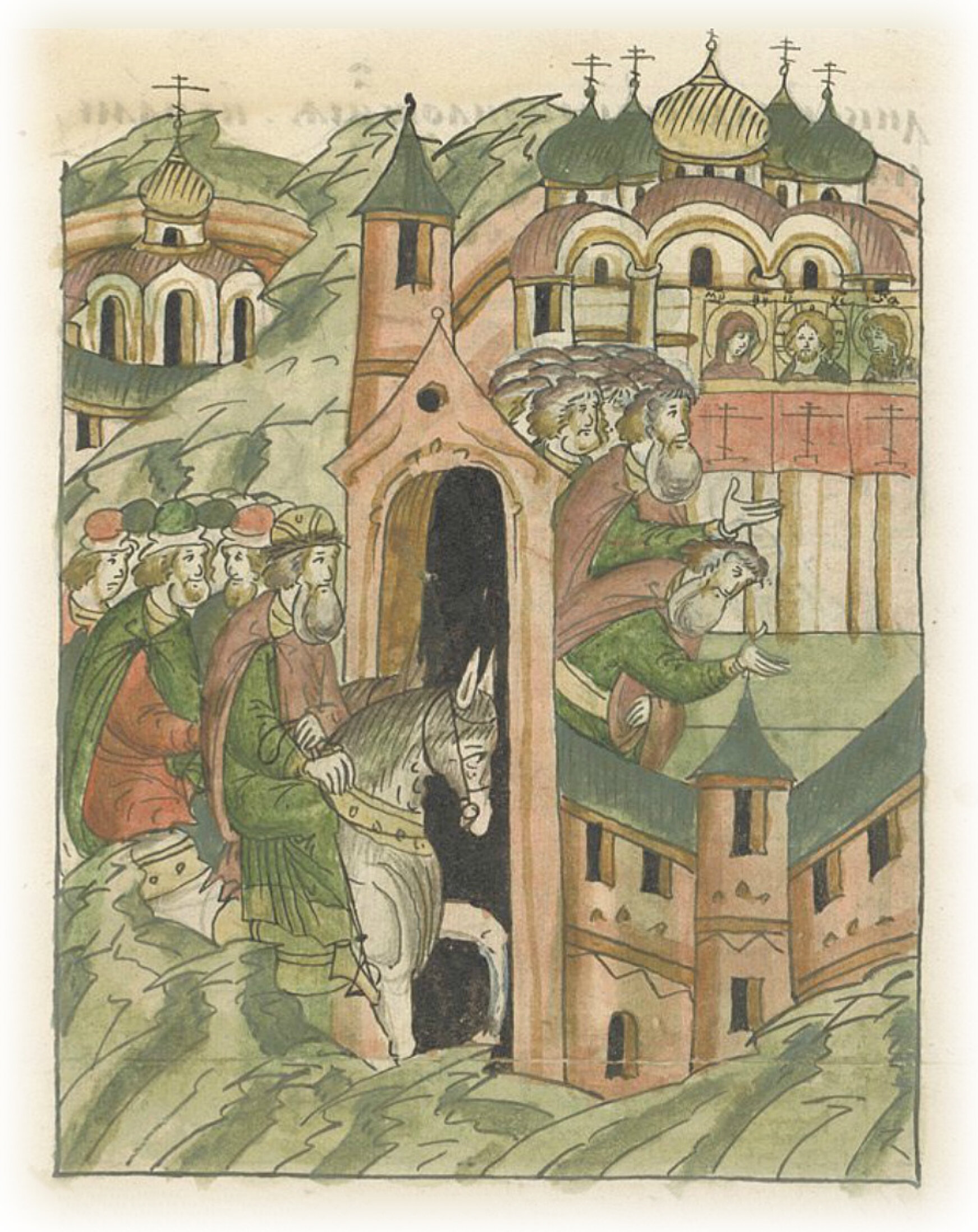 Когда же пришел в город Москву от живоначальной Троицы самодержец Василий, тут же пошел в соборную церковь пречистой Богородицы; и, увидев святые иконы, Спасов образ и пречистой Его матери, принесенные из города Владимира, с великим молением поклонившись образу Христа Бога Вседержителя и пречистой Его матери, с верою припал (к ним) и с великою радостью приложился и перекрестился у святых икон.