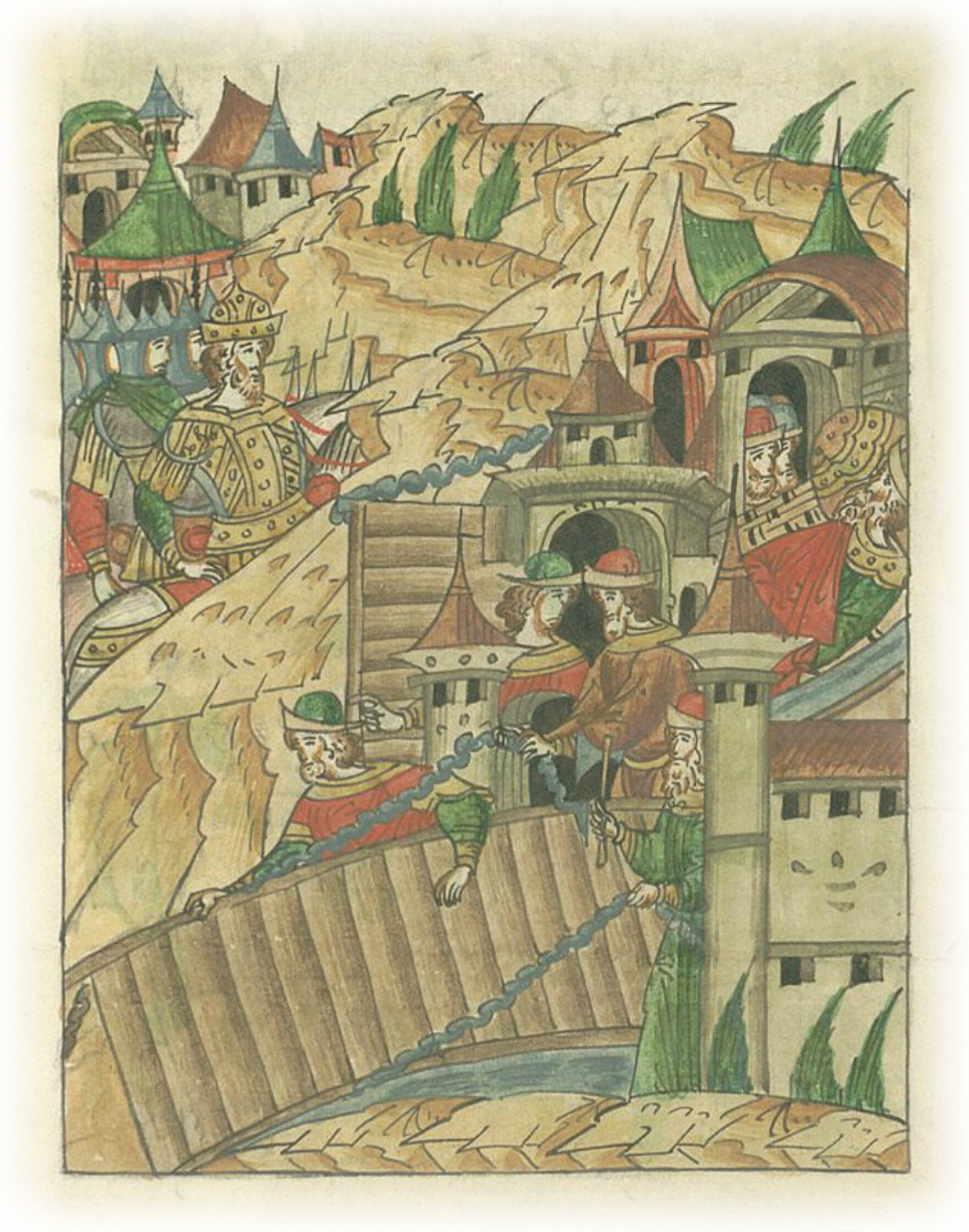 А князь Дашко к сроку подошел к городу в ночь на Святой неделе с пятьюстами воинами. И его советники, которых он отправил вперед служить, опустили возвод* и мост положили. * подъемная часть моста