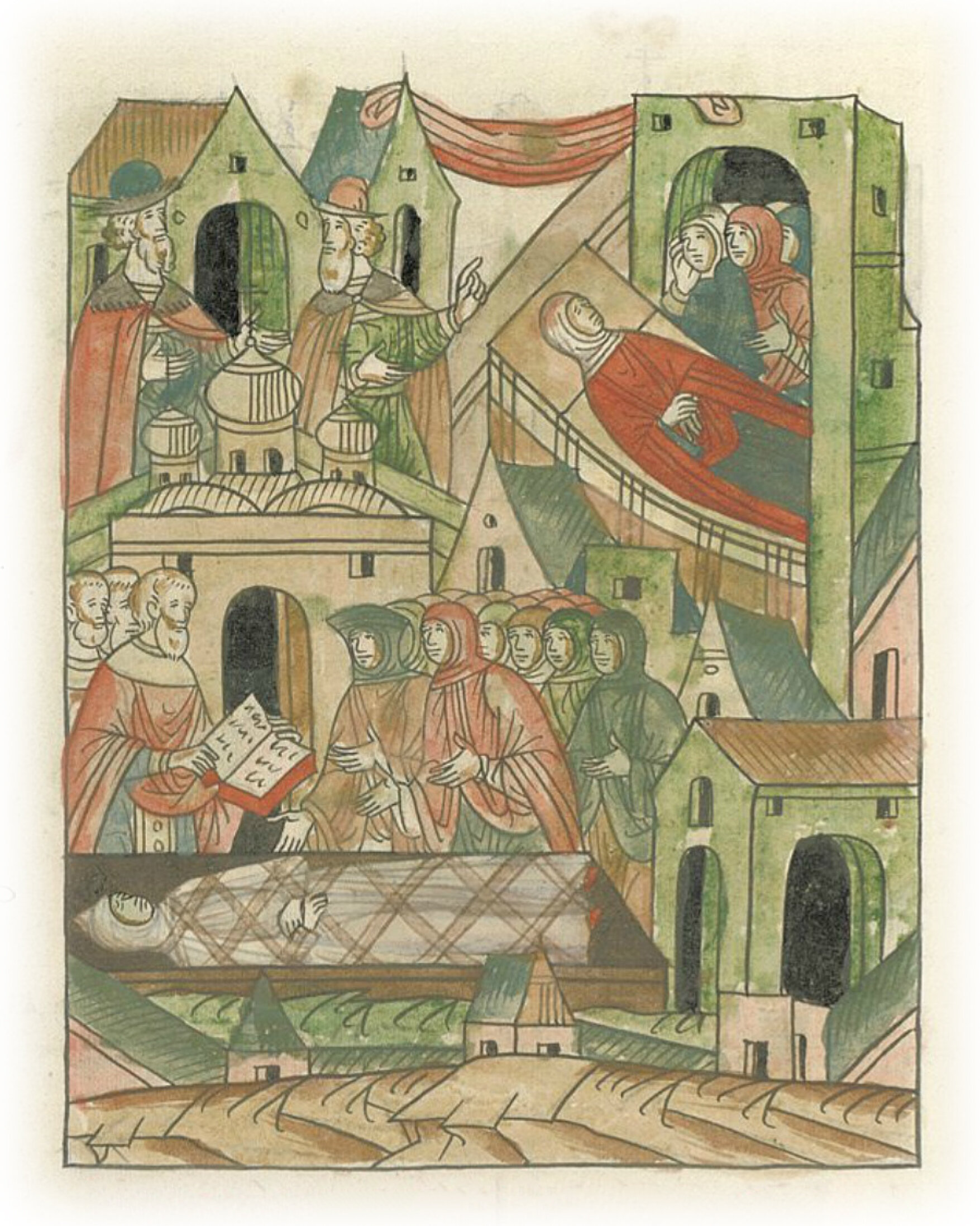 Кончина дочери великого князя Ивана Васильевича, княгини Феодосии, супруги князя Василия Даниловича Холмского, и ее похороны в церкви Вознесения в Москве.