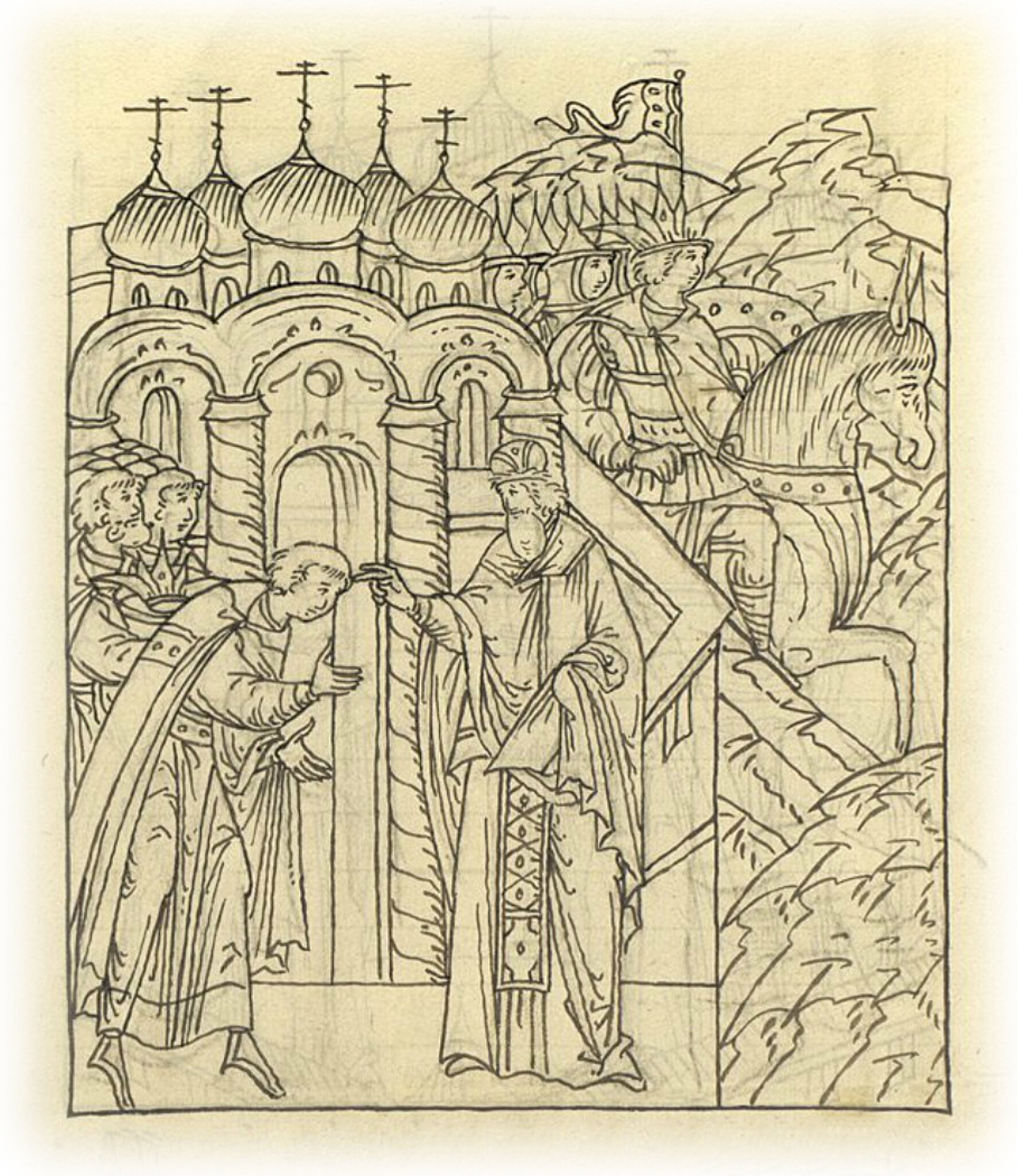 благословляется у владыки Феодосия, ему приказывает не выходить из церкви, пока чтолибо Бог не сотворит. А сам государь сел на своего коня и приехал в свой полк, полк же вскоре собрался.