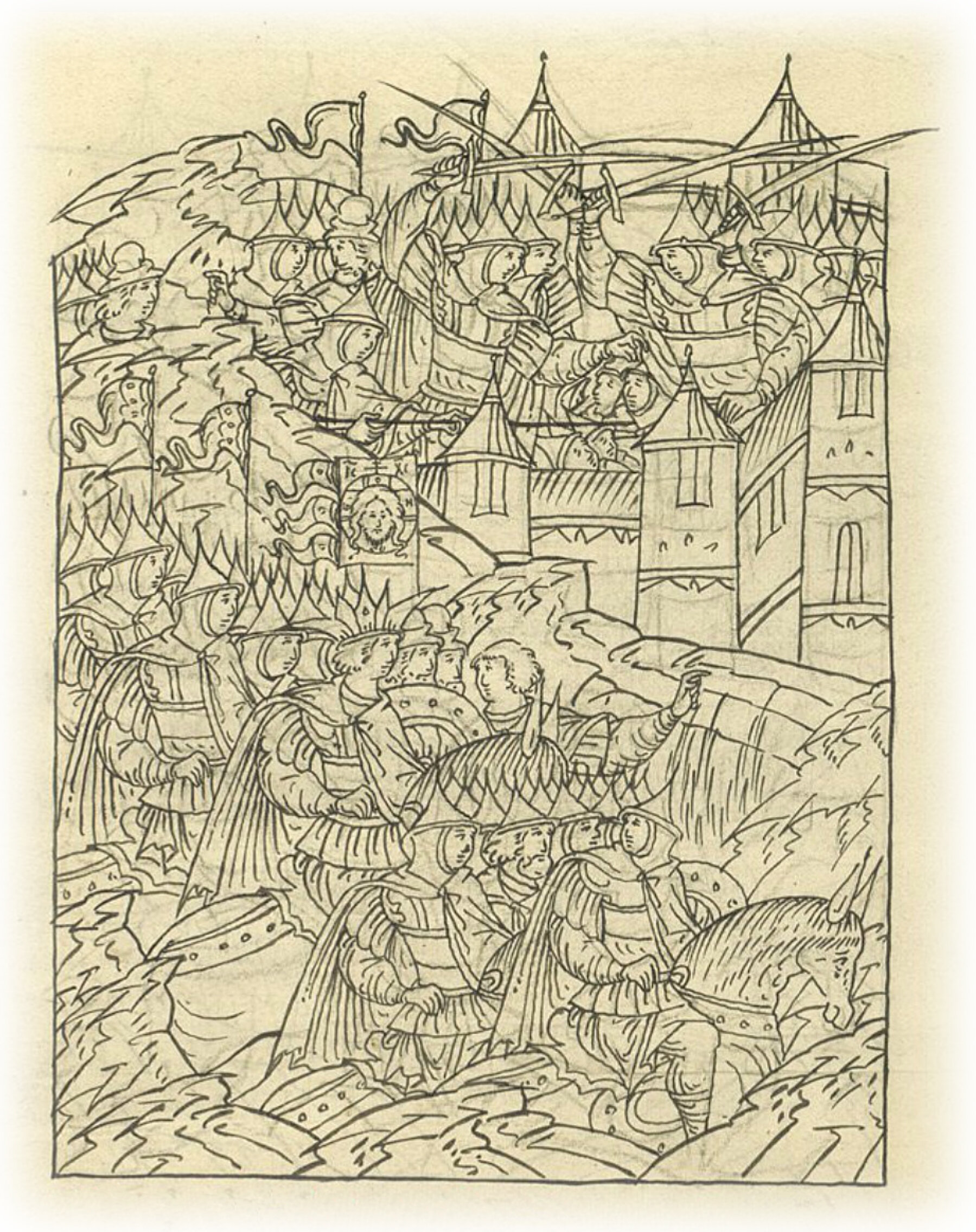 Сеча в городе Казани. Государю же от князя Михаила Воротынского доносят, что Божьим милосердием люди царя в городе бьются с неверными, и нужна помощь государя.