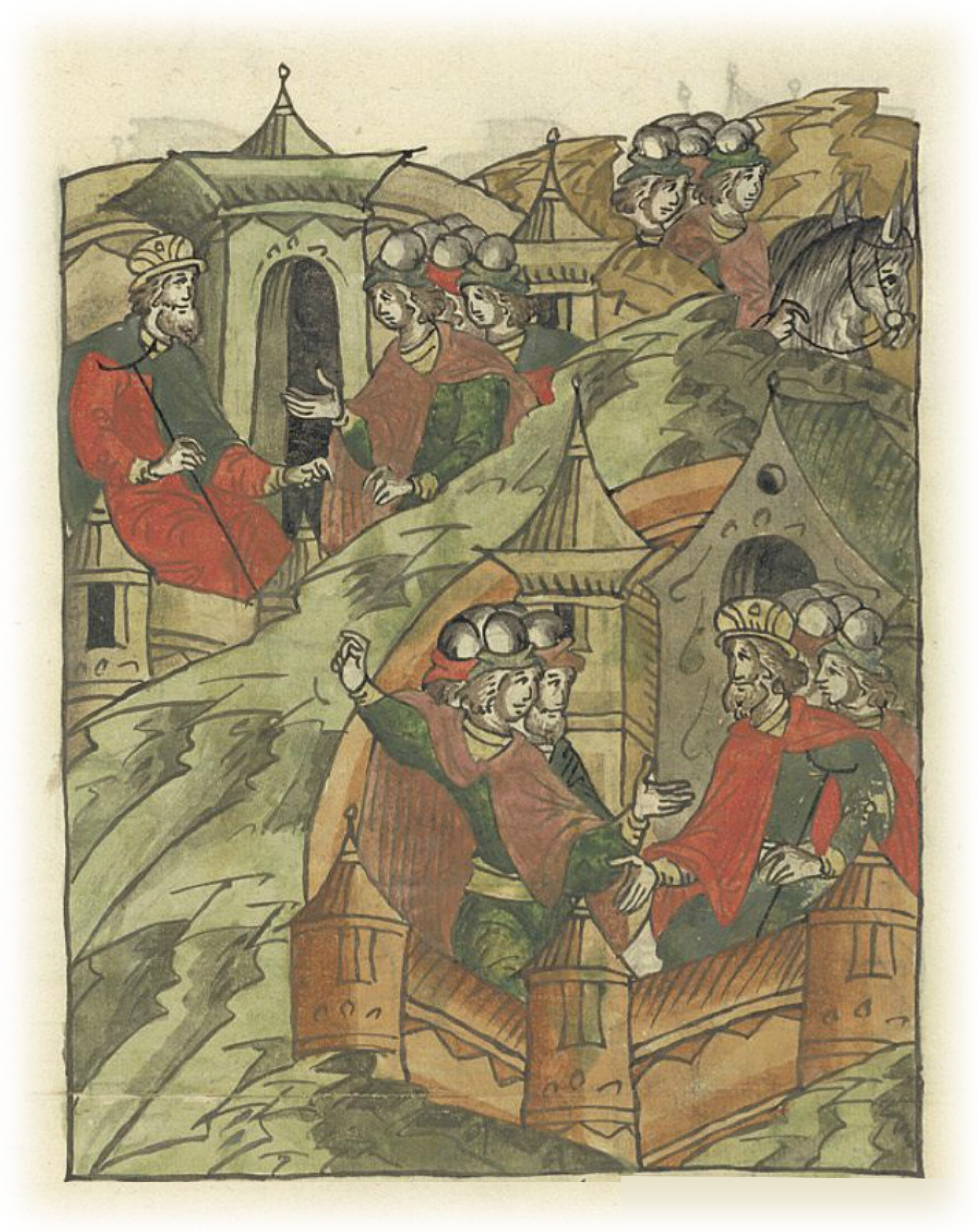 Ругодивские посадники Яким и Захар приезжают в Москву. Воеводы царя Ивана Васильевича Алексей Адашев и Иван Михайлов сообщают им, что государь пожалует их, если сдадут его воеводам помимо Ругодива Вышгород.
