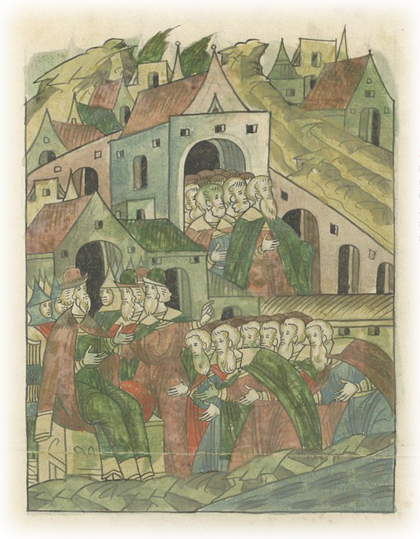 Новгородские бояре, дети боярские, зажиточные мужи бьют челом великому князю в службу.
