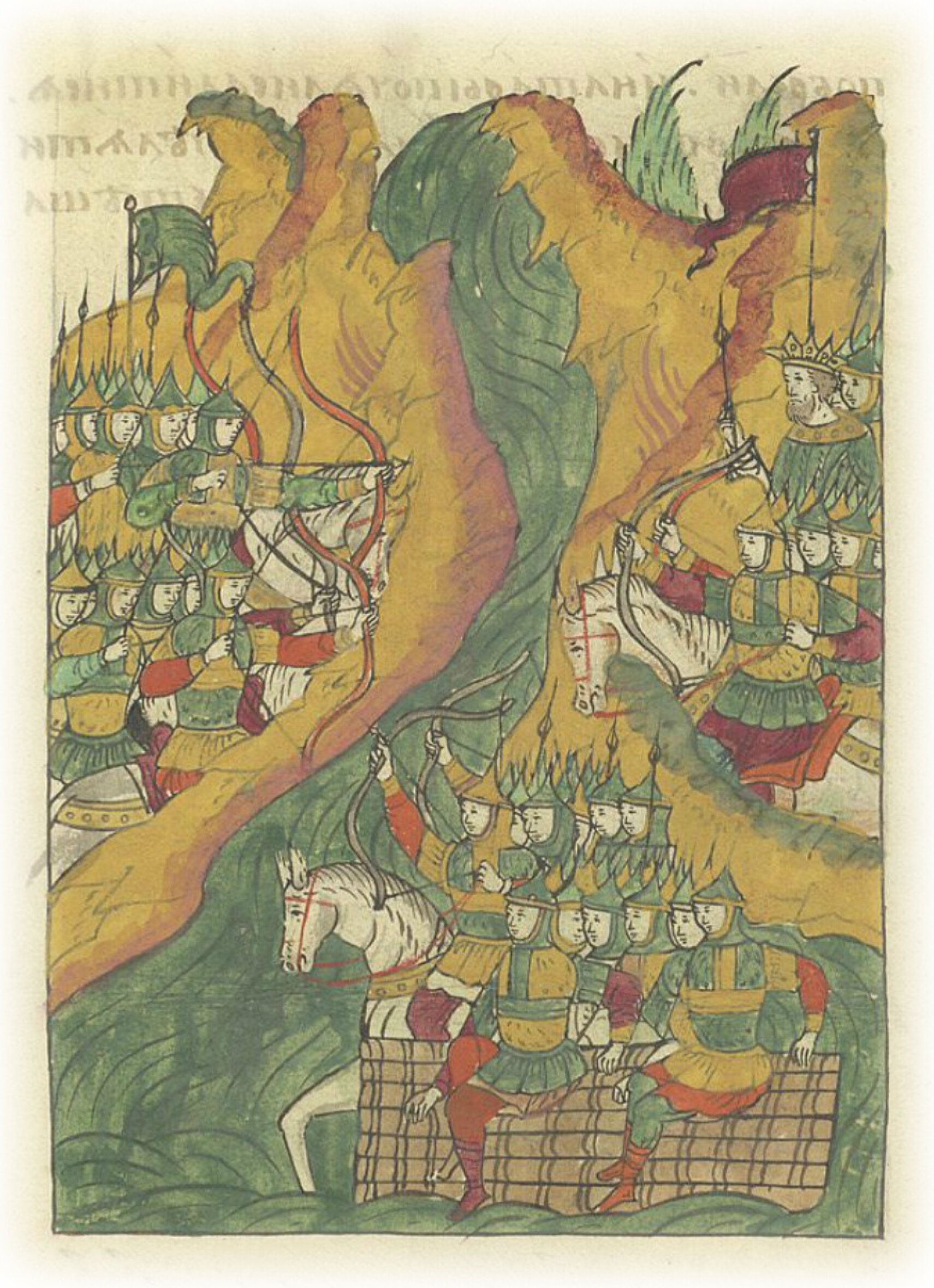 а прежде того пришел на берег с передовым полком князь Иван Иванович Турунтай Пронской да князь Василий Охлябинин и начали с татарами стреляться. Татары же увидели передовой полк и думали, что это все люди, вышли на берег быстро со многими людьми, и в реку побрели, и на тары начали садиться; а из передового полка начали стрелять многими стрелами, и полетели стрелы, как дождь.