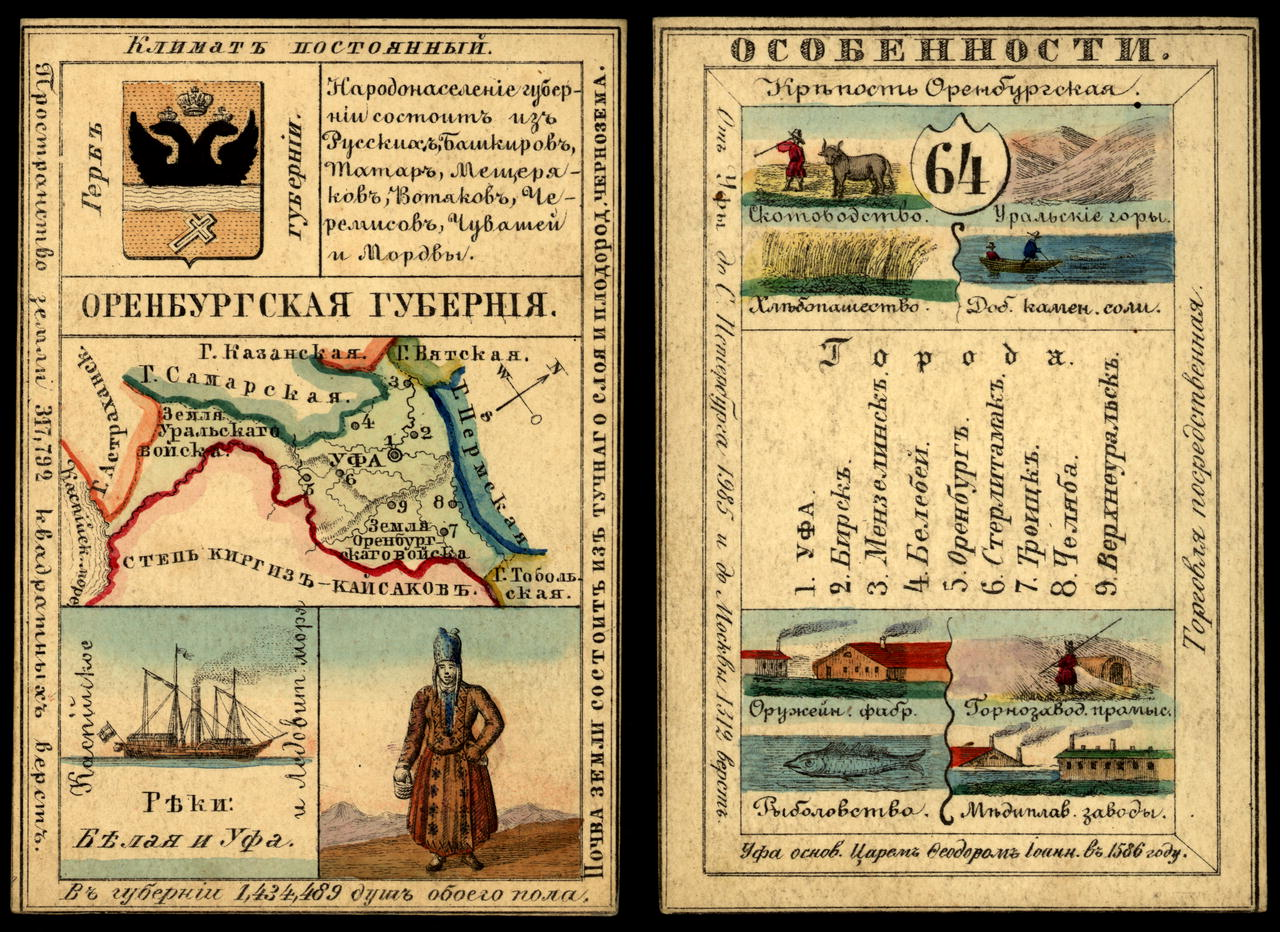 Оренбургская губерния административная единица Российской империи. Центр — город Оренбург.Оренбургская губерния располагалась на Юго-Востоке Европейской части России и имела площадь в 190 кв. км. Южный Урал пересекает губернию, при этом отдельные вершины его (Яман-тау) достигают 1640 м. Склоны гор покрыты лесами (до 2 тыс. кв. км). Восточная азиатская часть губернии и Юг носят степной характер. Почва в гористых местностях каменистая, в степных — чернозем.