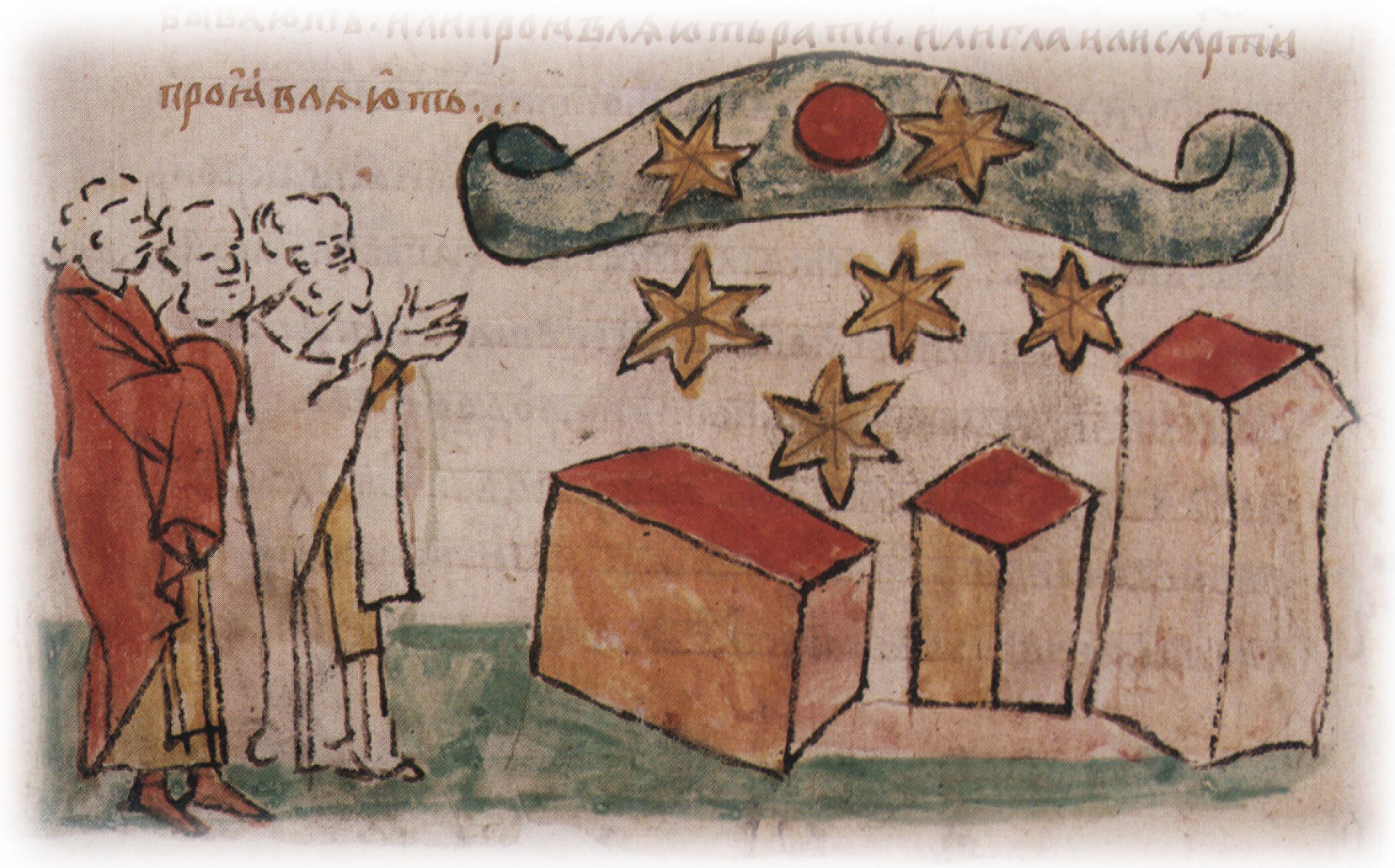 Тайное погребение Владимира Святославича, умершего в Берестове: спуск его тела на землю на ковре между разобранными клетьми здания; положение тела Владимира в мраморный гроб в церкви Святой Богородицы.