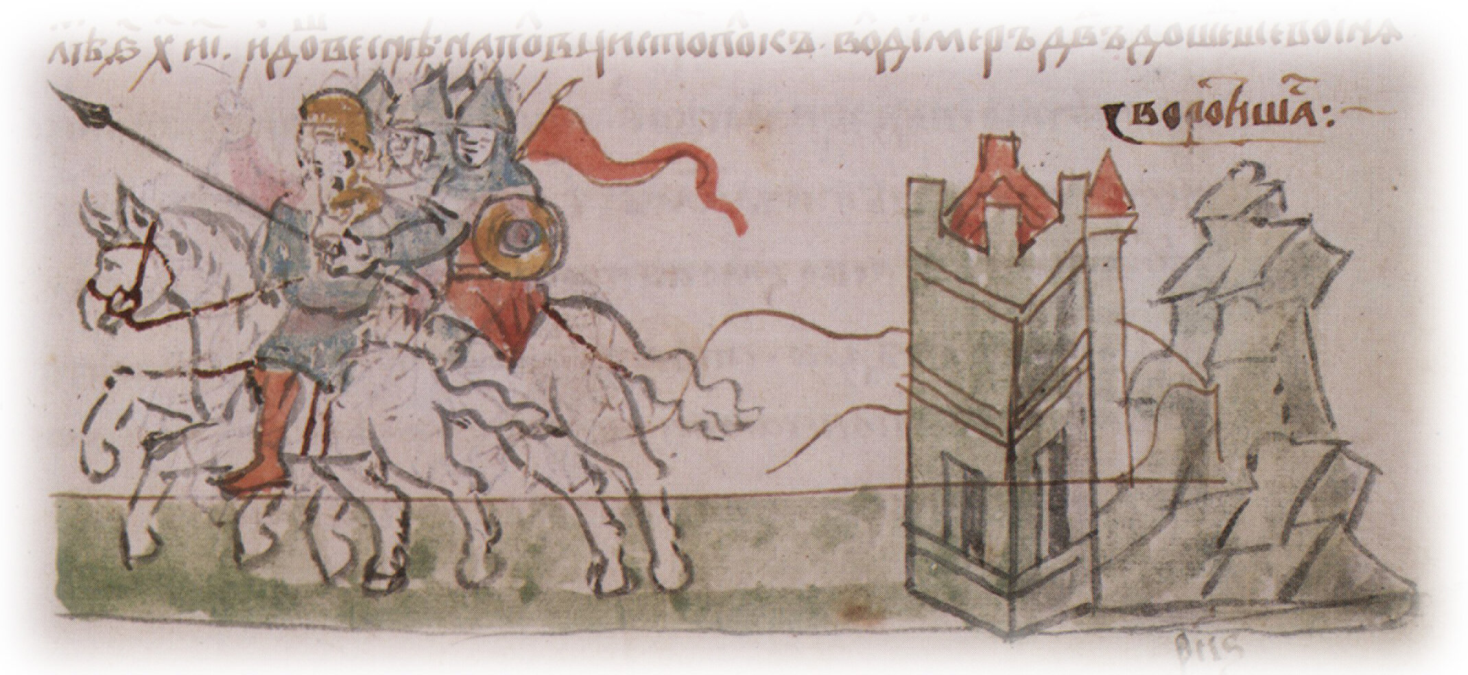 Рисунок "мастера Б" — перо. Правлен (фигуры, лица, шапка, шлемы, копье, щит, лошади, архитектура) и дополнен (лещадка) "мастера В" — кисть. Позднейшая пририсовка сбруи — перо.