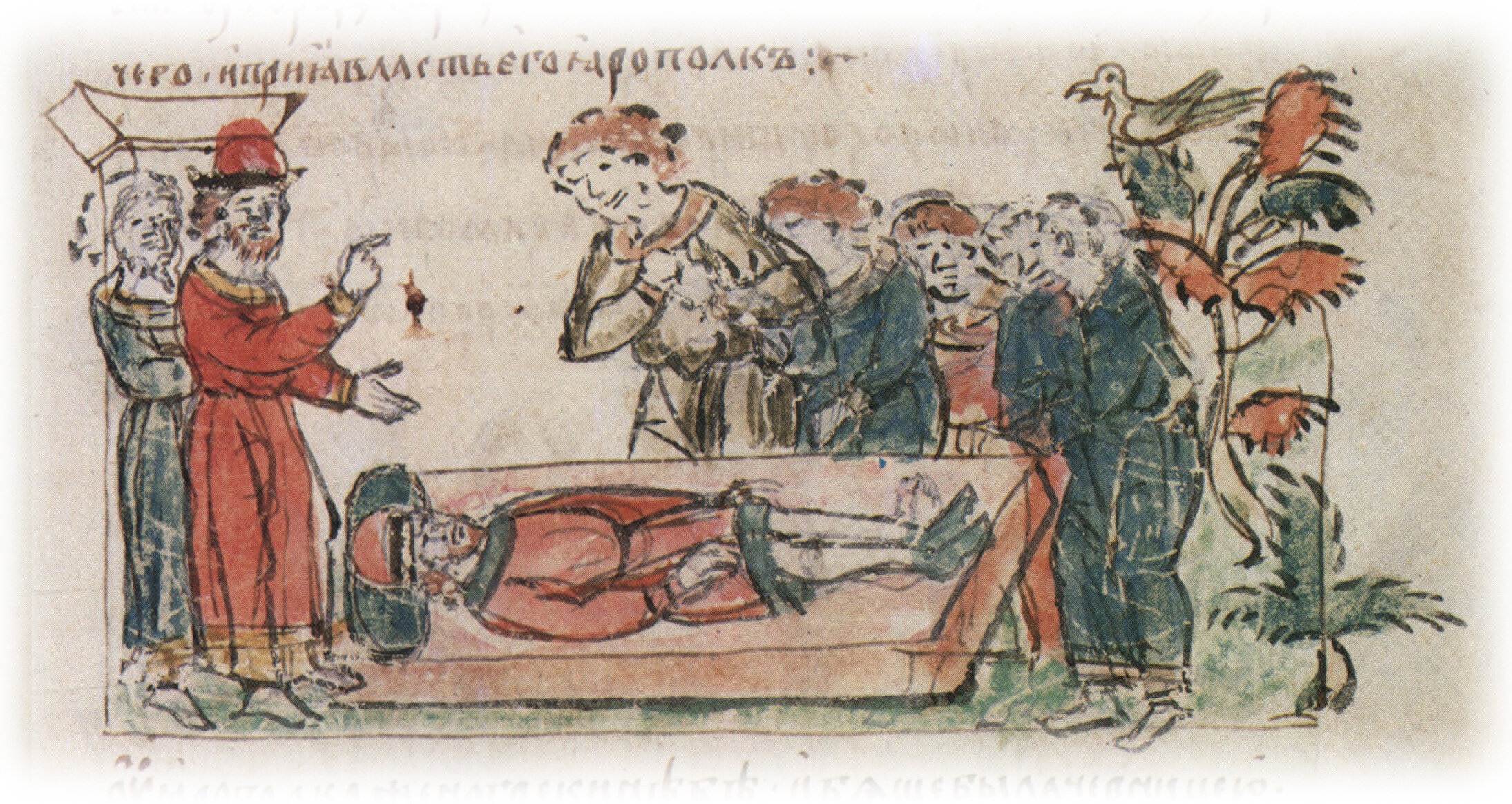 Тайное погребение Владимира Святославича, умершего в Берестове: спуск его тела на землю на ковре между разобранными клетьми здания; положение тела Владимира в мраморный гроб в церкви Святой Богородицы.