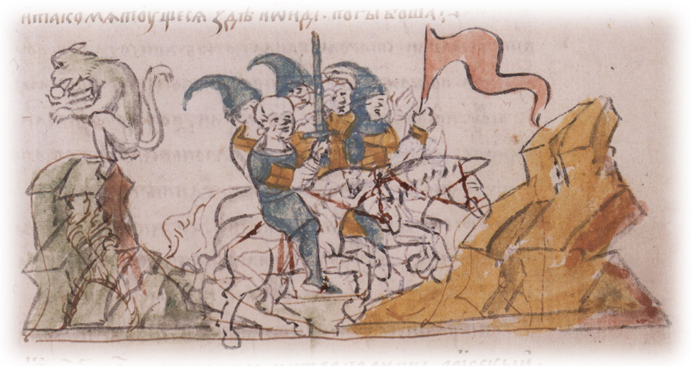 Рисунок "мастера Б" — перо. Правлен (фигуры, лица, шапки, лошади, скала) и дополнен (знамя, обезьяна, лещадка) "мастера В" — кисть. Позднейшая пририсовка сбруи и стремени — перо.